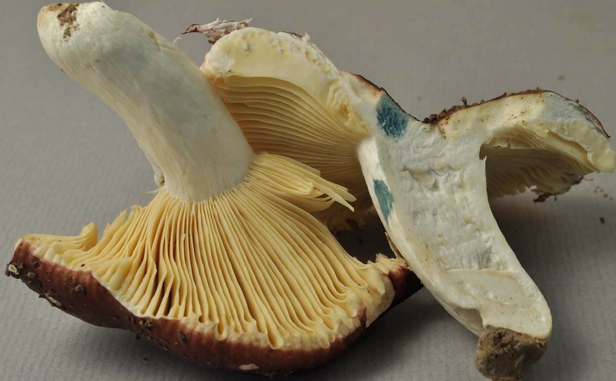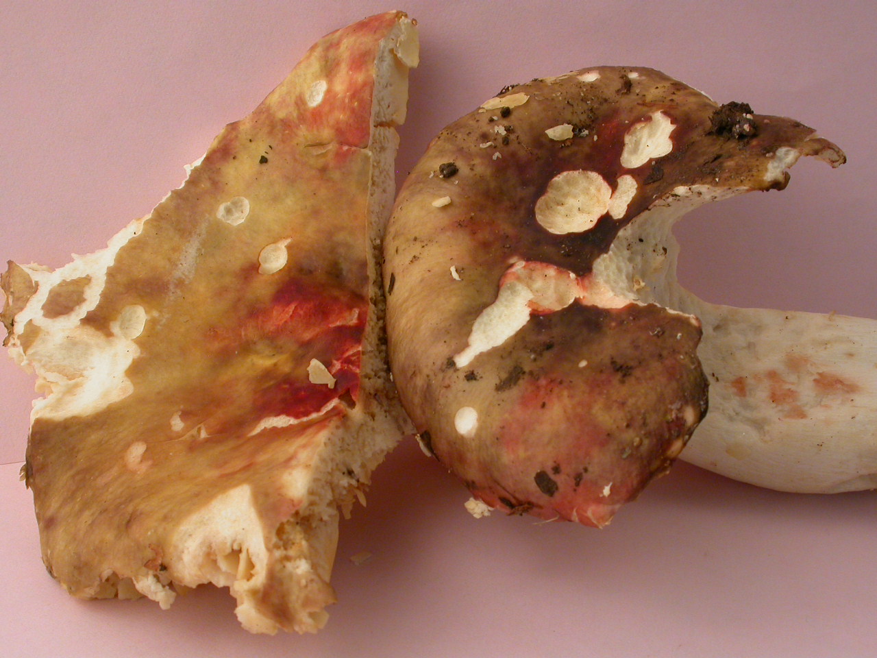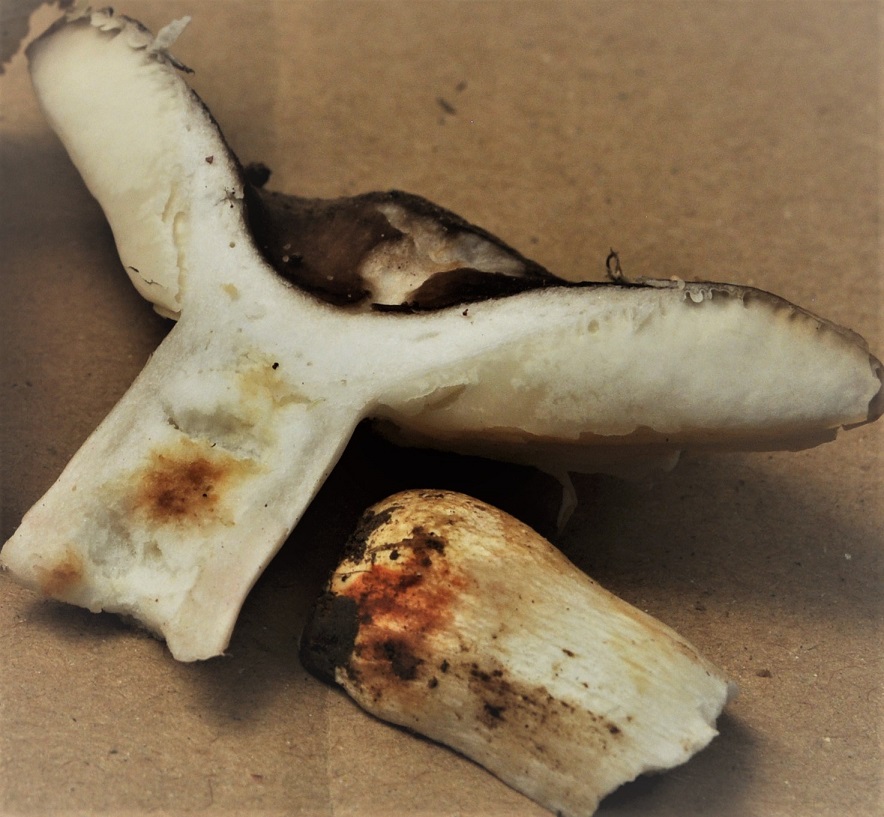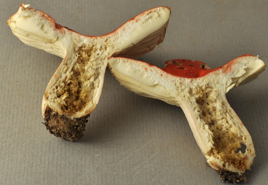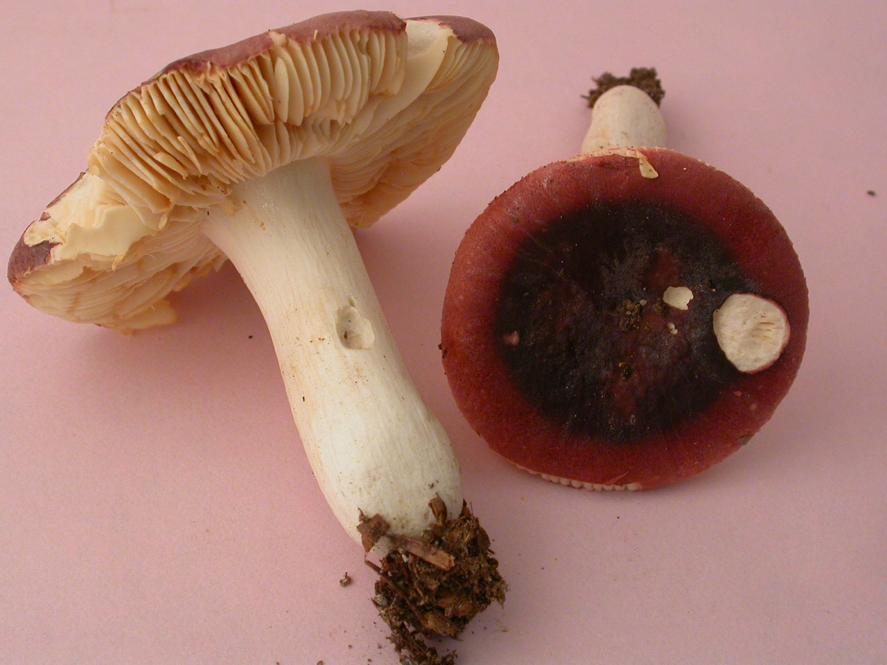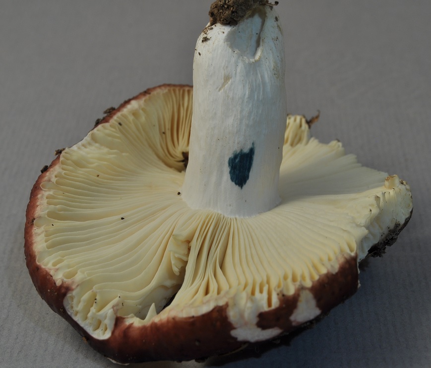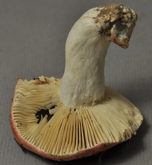 A voir dans la coupe les lames adnées ou émarginées, ligne de Trindel 2, arête rougeâtre à la marge, chair se colorant de brunâtre. Standard R.suberythropus..