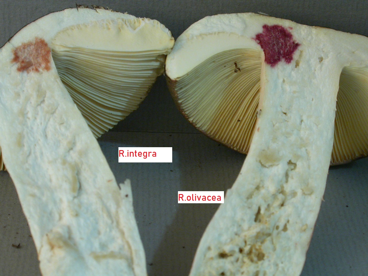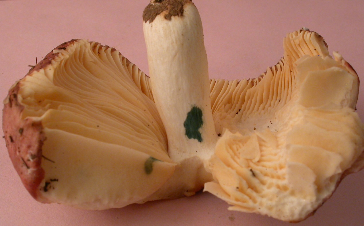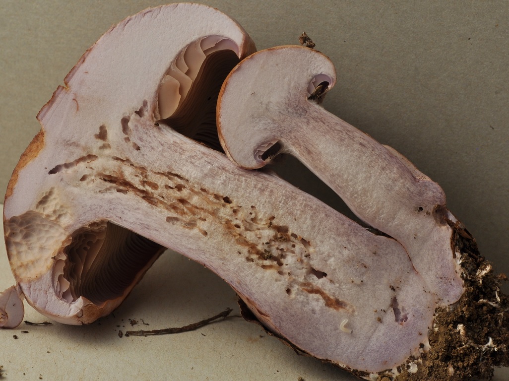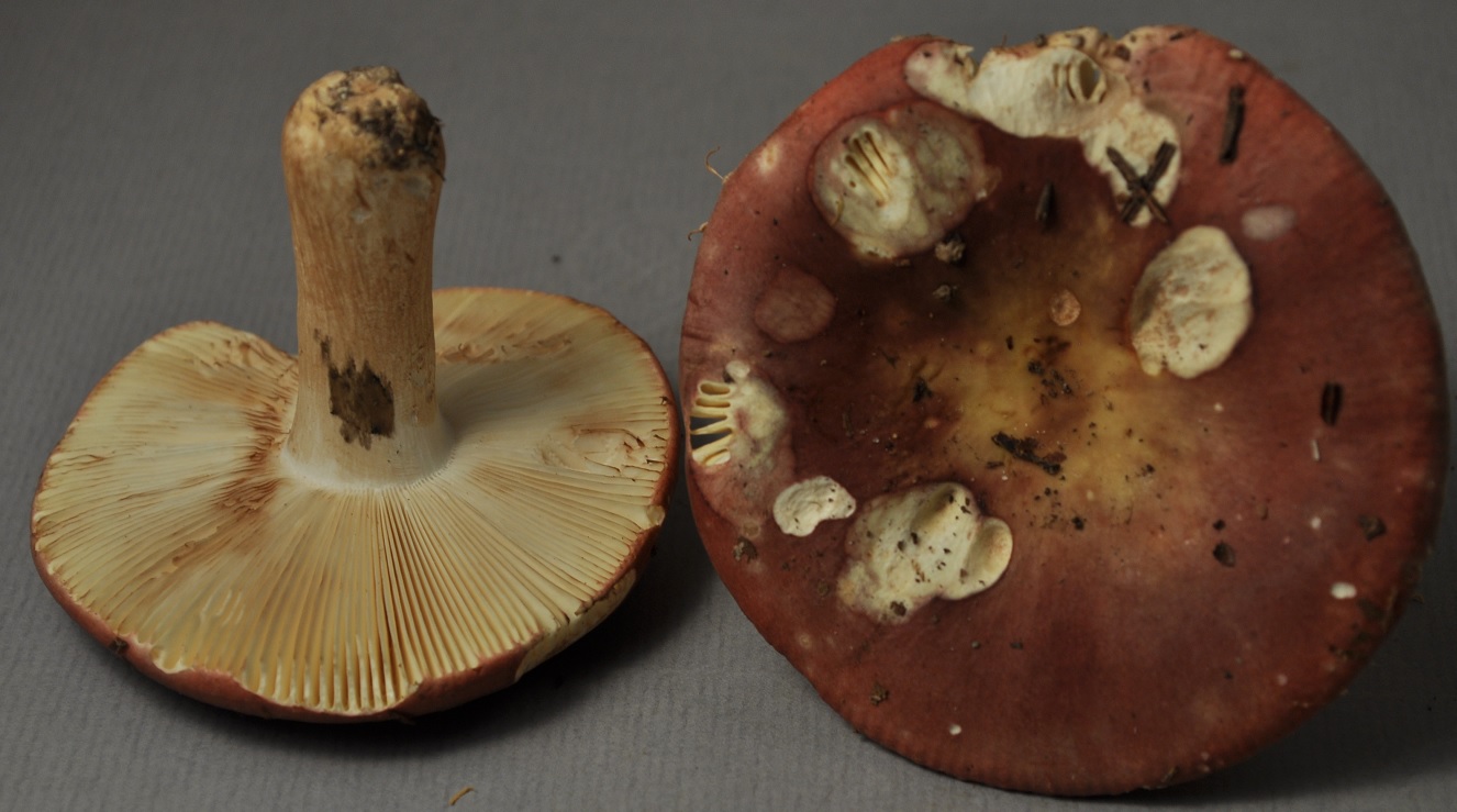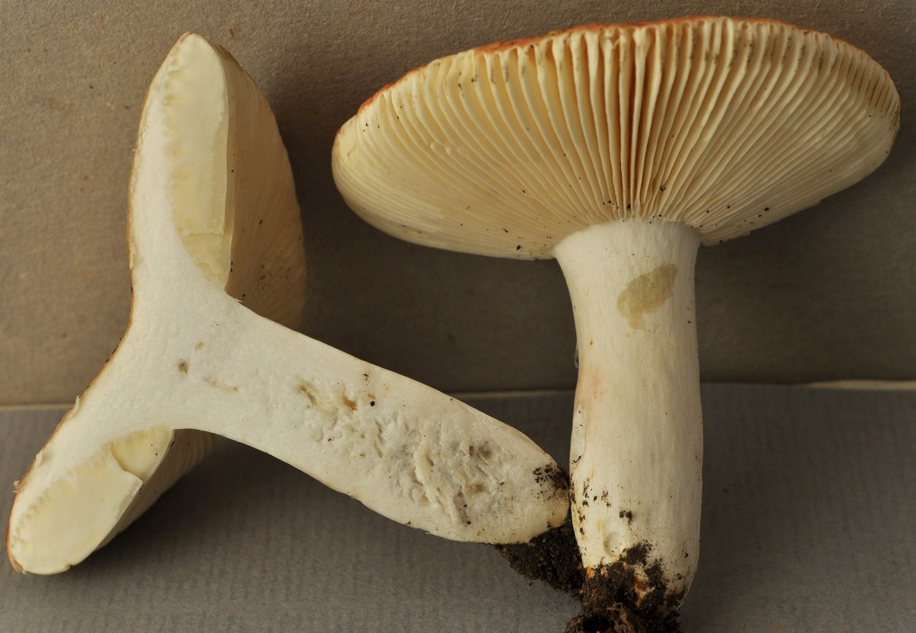 A voir dans la coupe les lames adnées ou émarginées, ligne de Trindel 2, arête rougeâtre à la marge, chair se colorant de brunâtre. Standard R.suberythropus..
