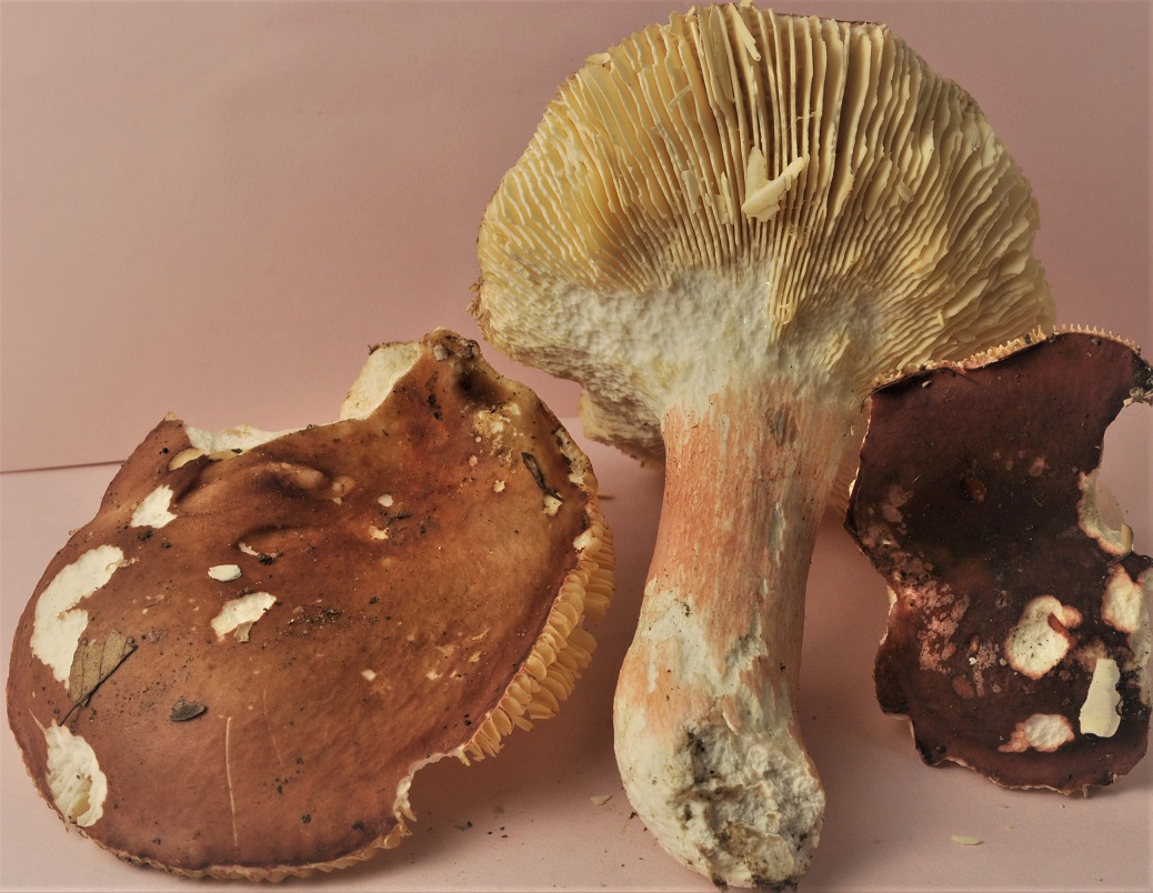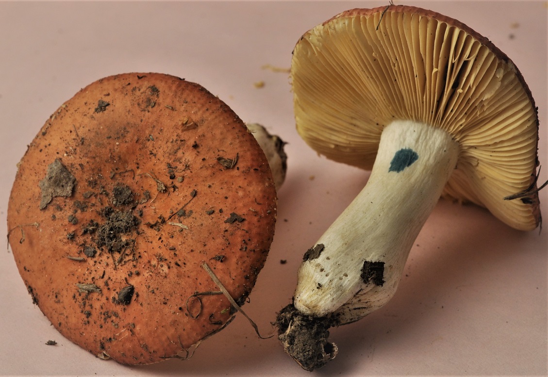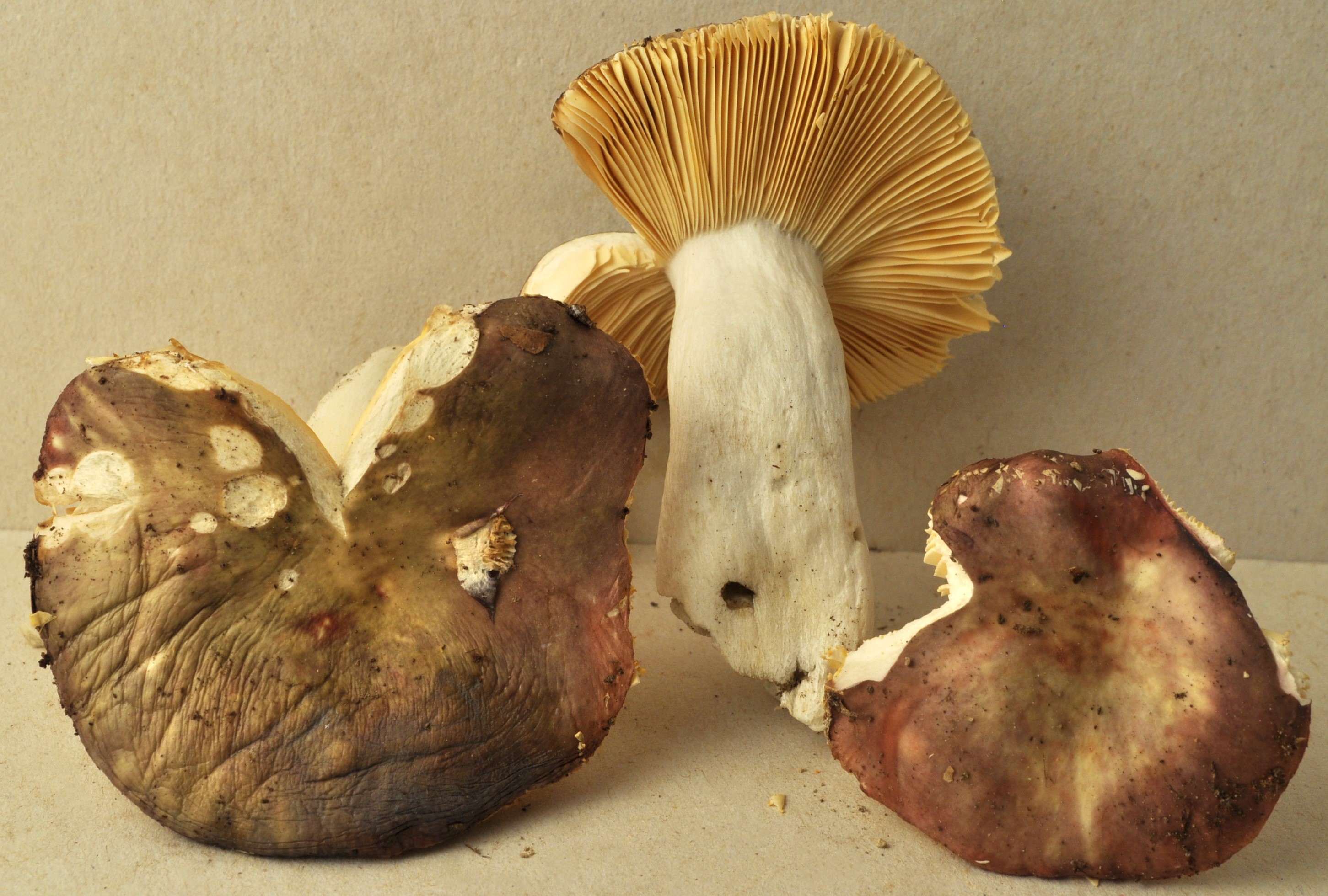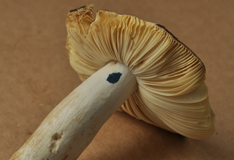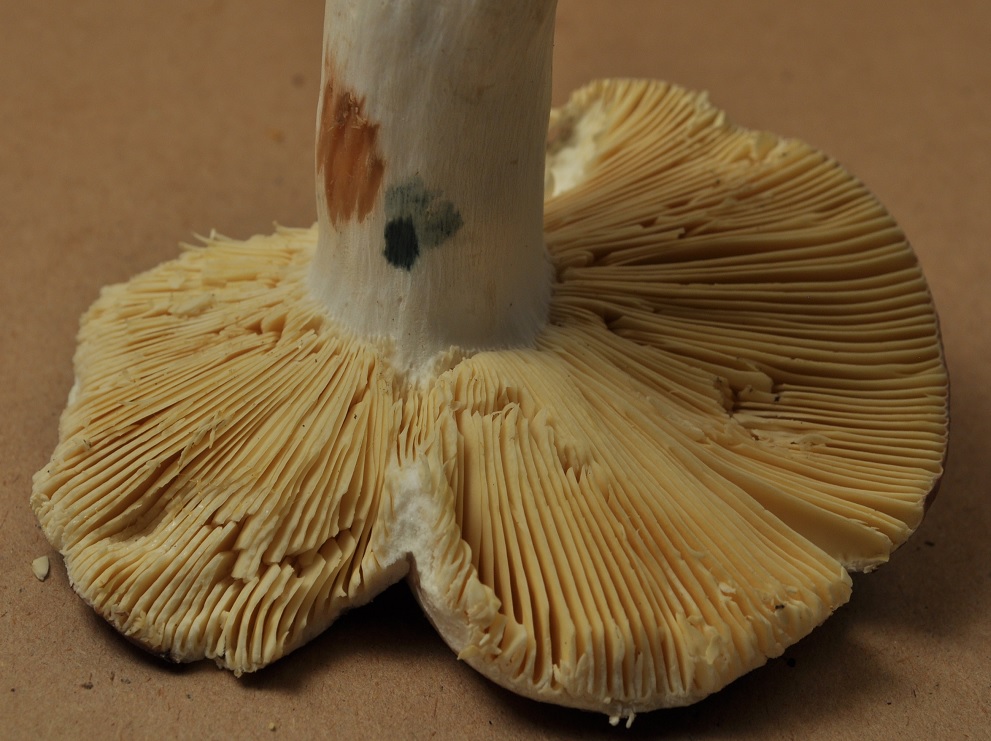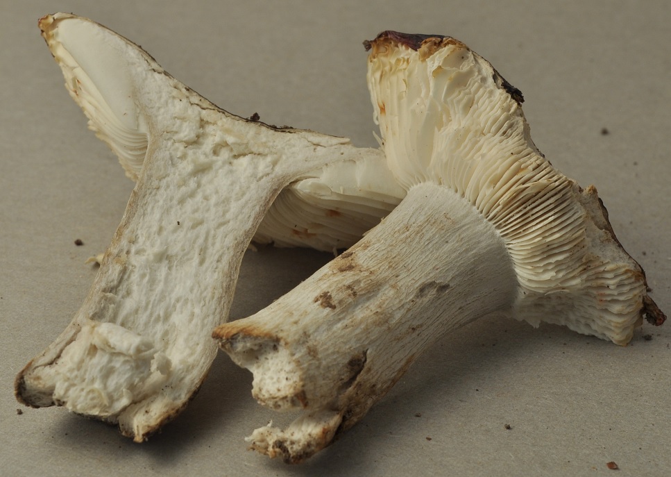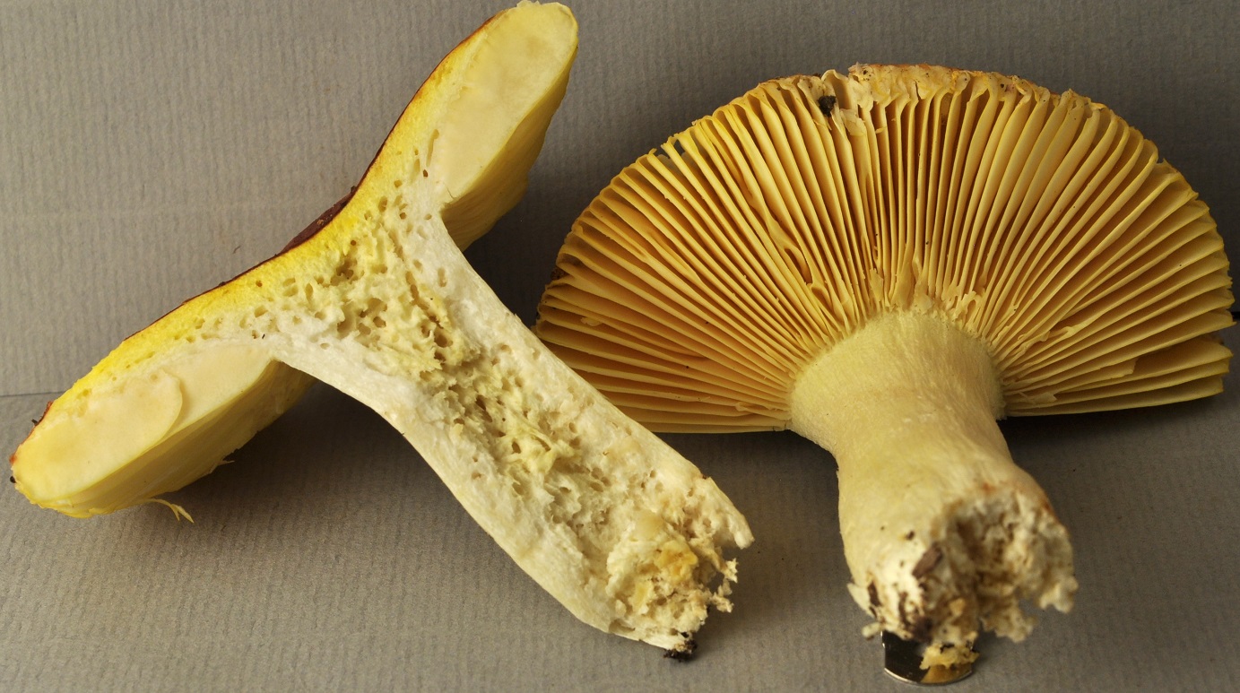 A voir dans la coupe les lames adnées ou émarginées, ligne de Trindel 2, arête rougeâtre à la marge, chair se colorant de brunâtre. Standard R.suberythropus..