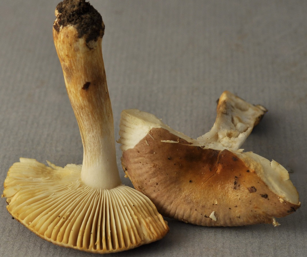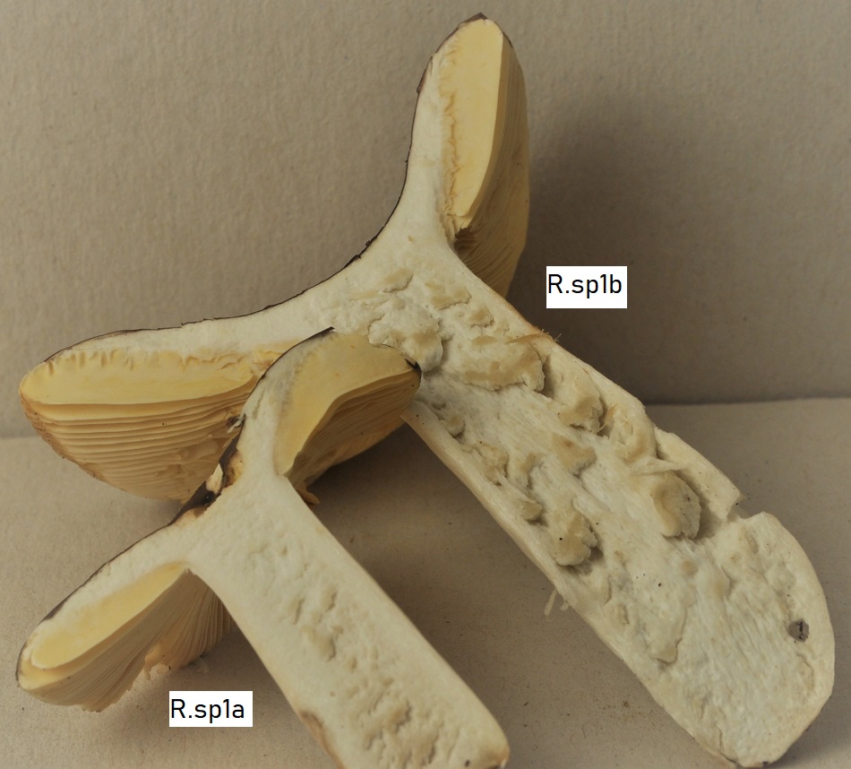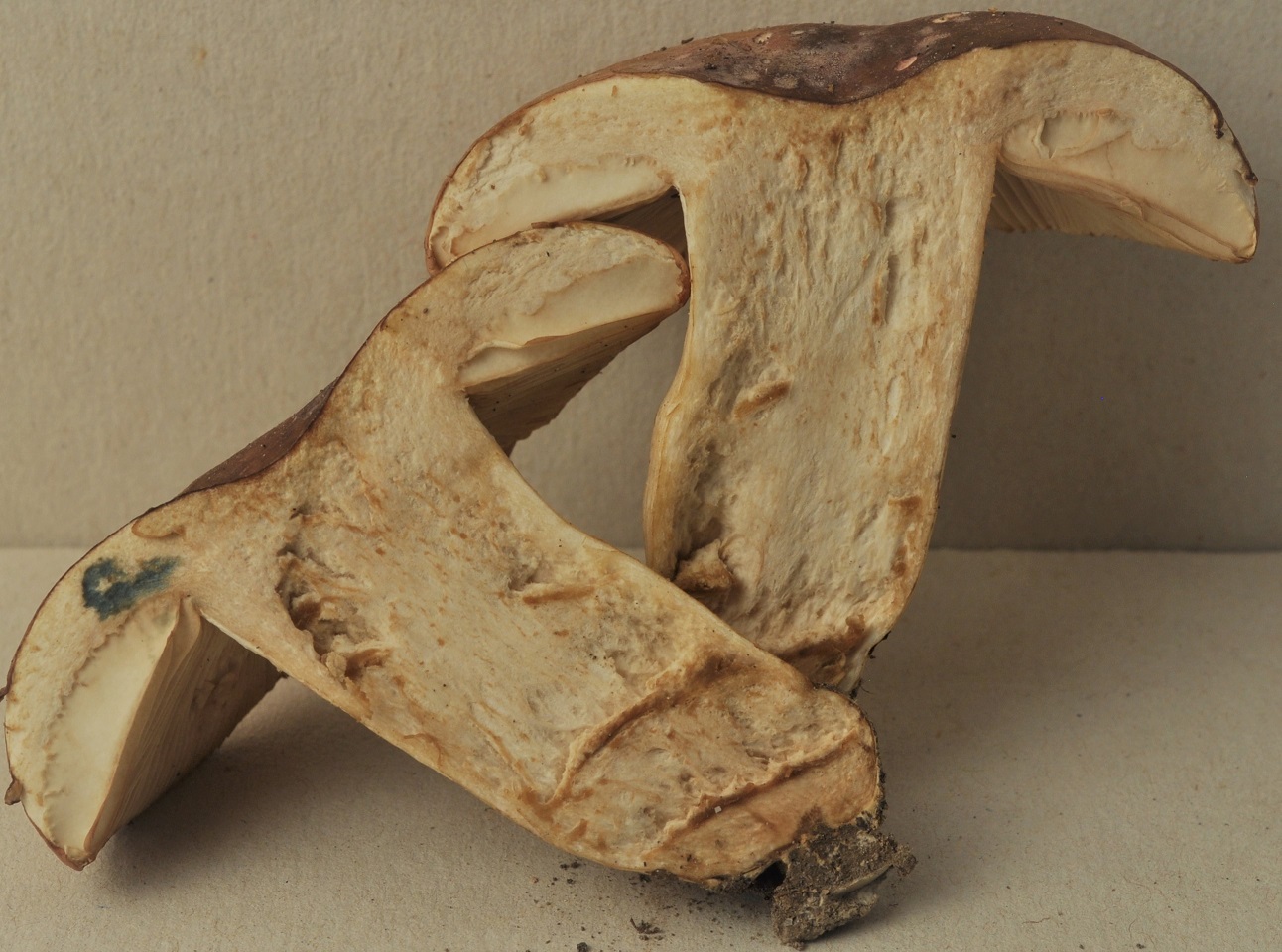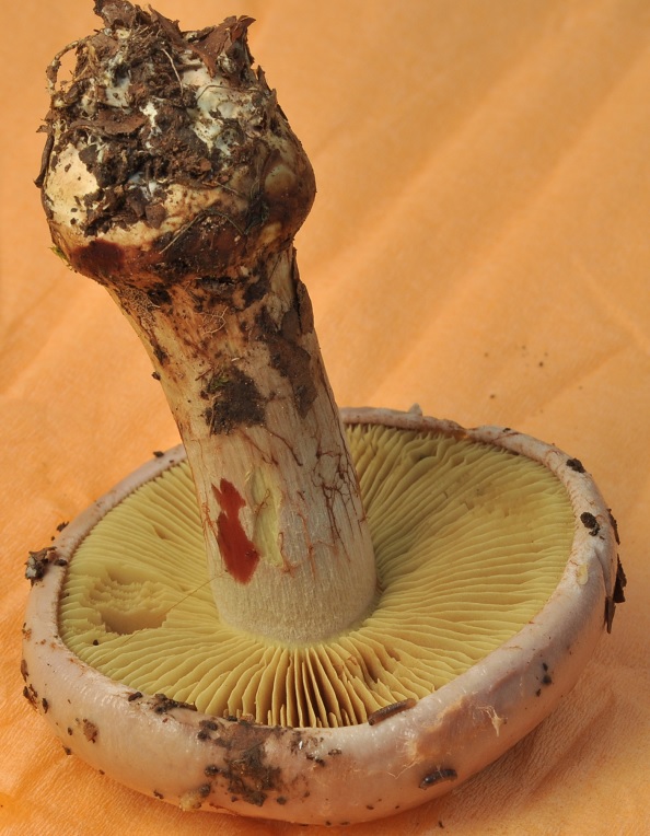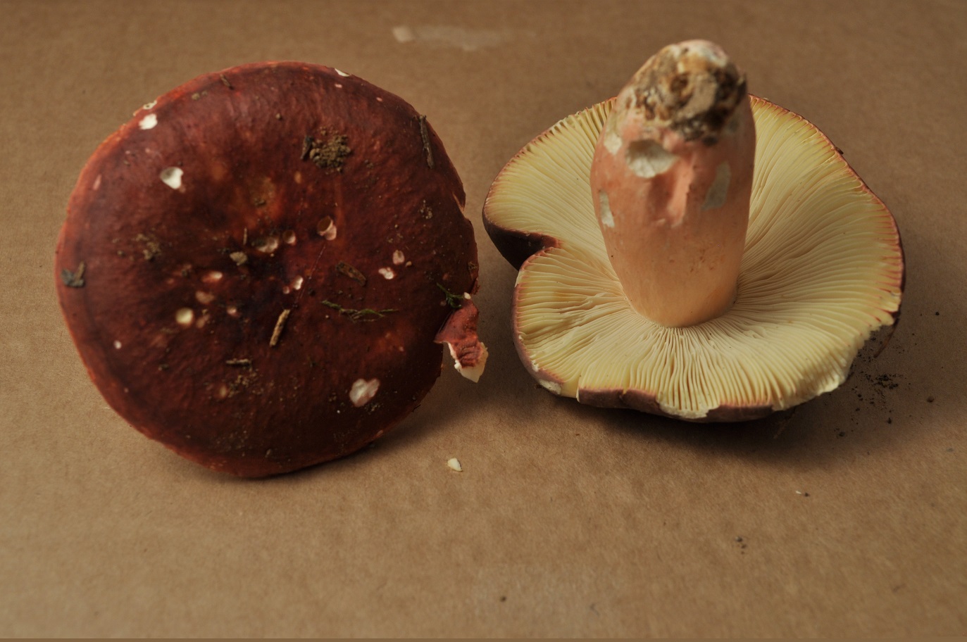 A voir dans la coupe les lames adnées ou émarginées, ligne de Trindel 2, arête rougeâtre à la marge, chair se colorant de brunâtre. Standard R.suberythropus..