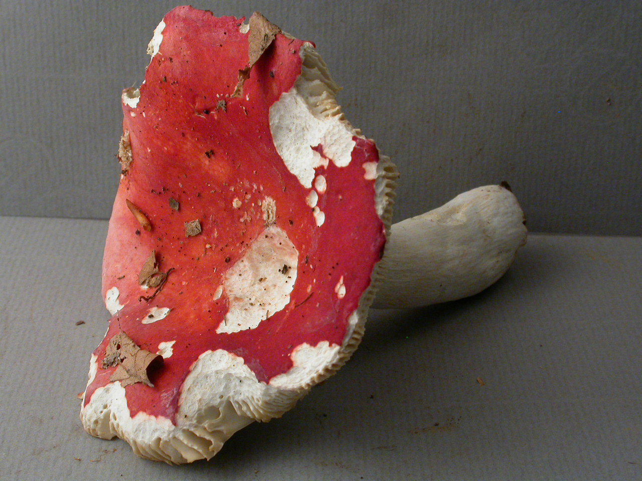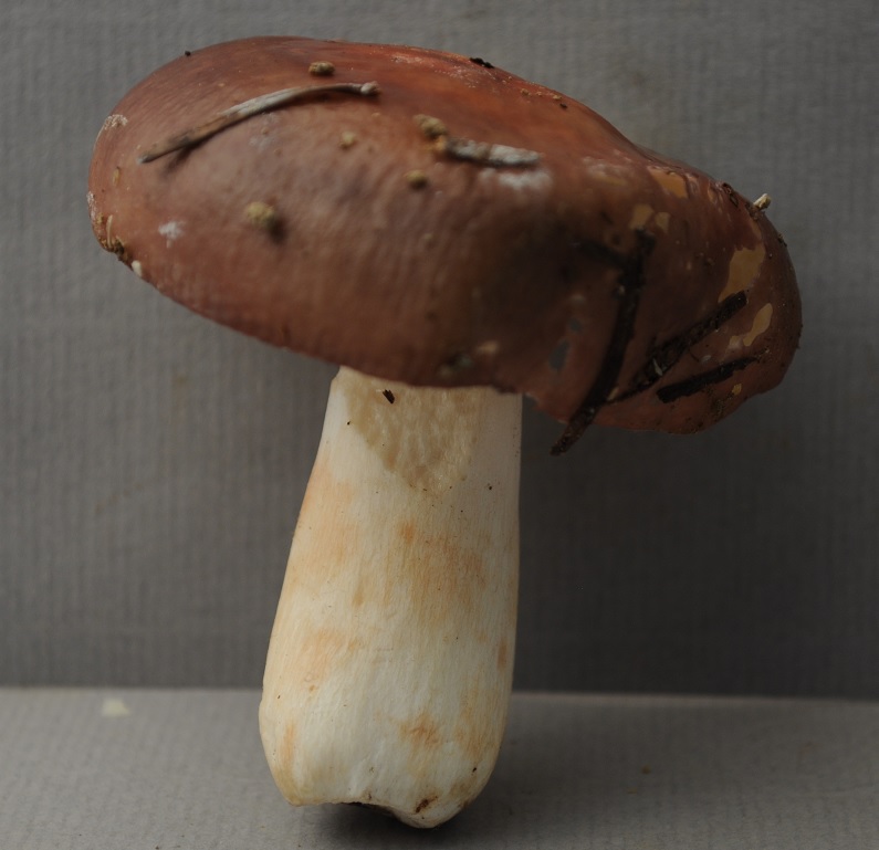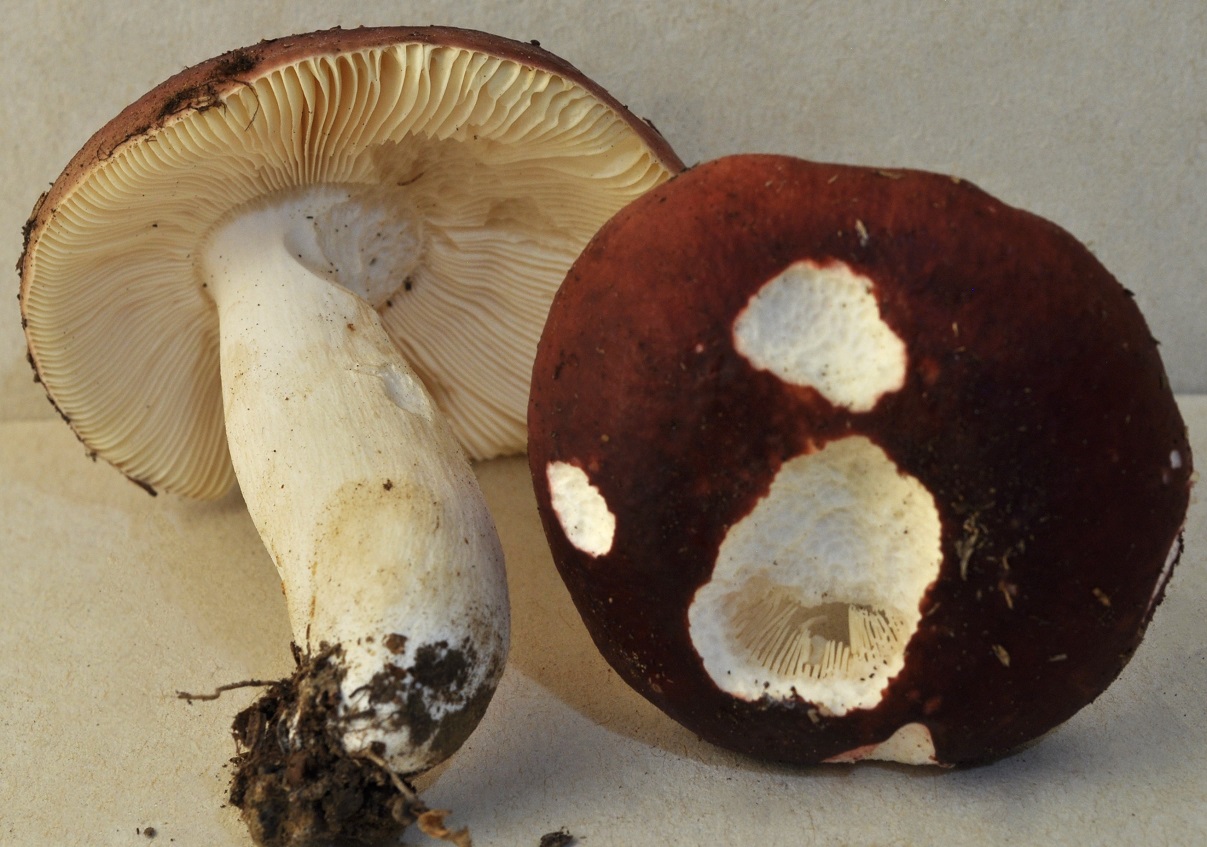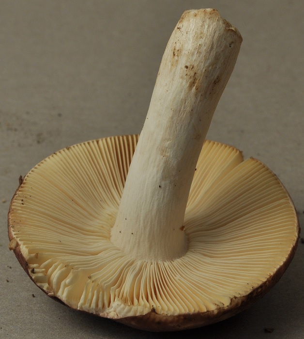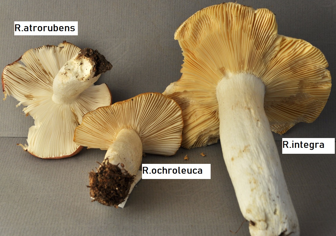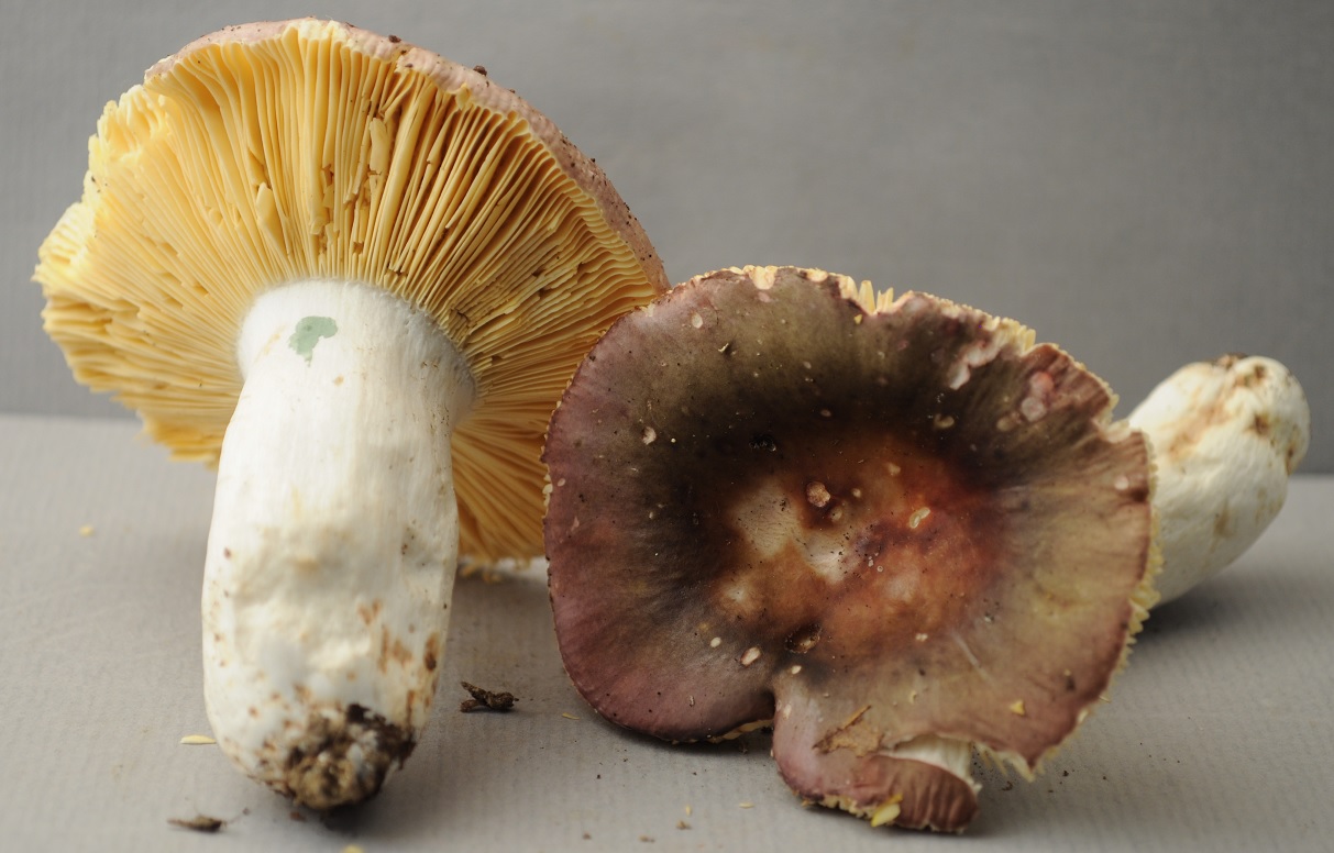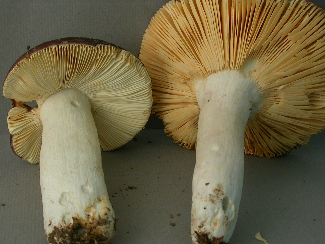 A voir dans la coupe les lames adnées ou émarginées, ligne de Trindel 2, arête rougeâtre à la marge, chair se colorant de brunâtre. Standard R.suberythropus..