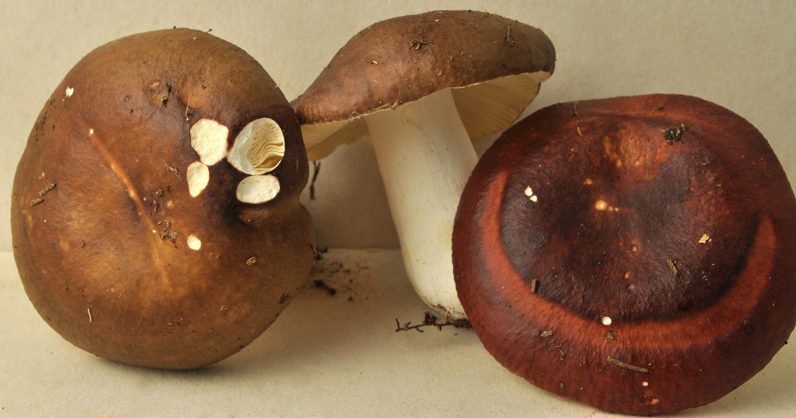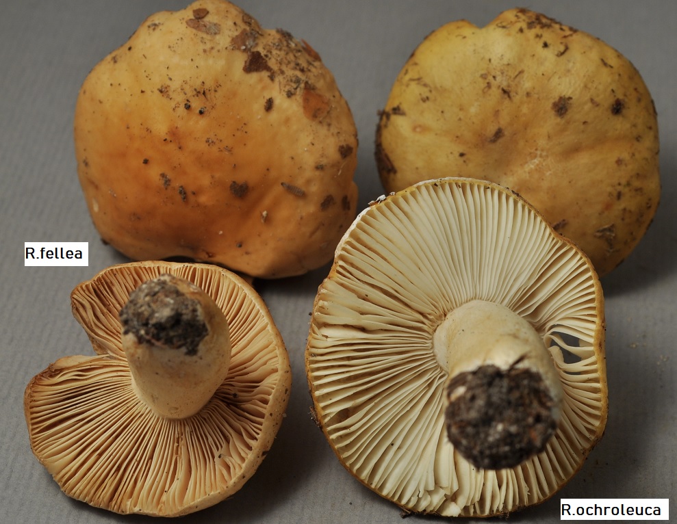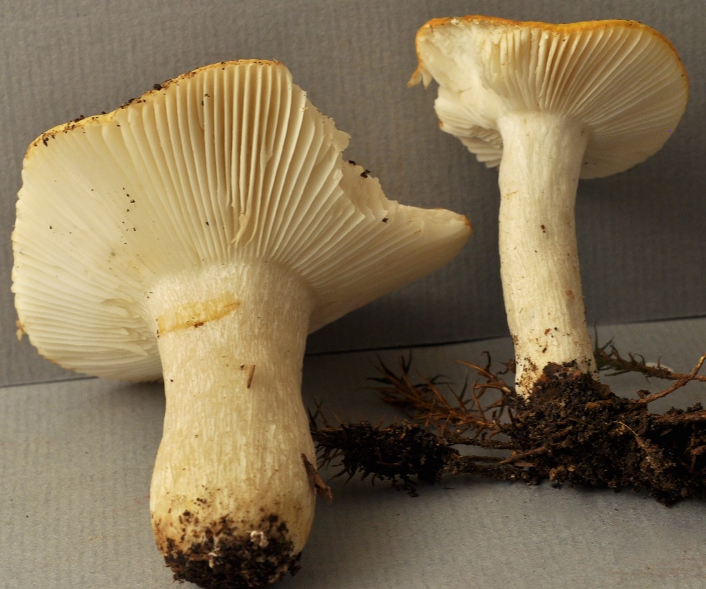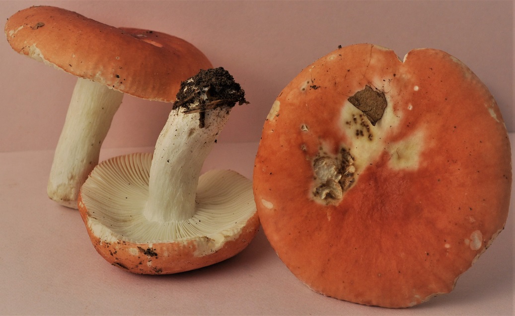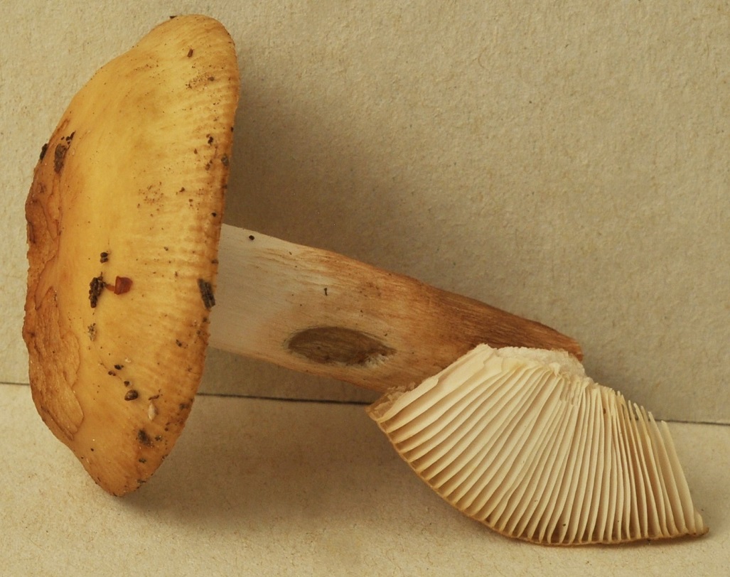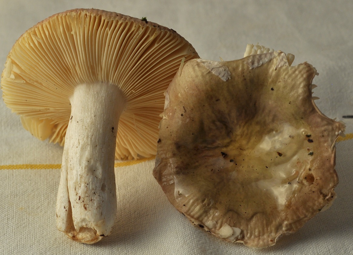 A voir dans la coupe les lames adnées ou émarginées, ligne de Trindel 2, arête rougeâtre à la marge, chair se colorant de brunâtre. Standard R.suberythropus..