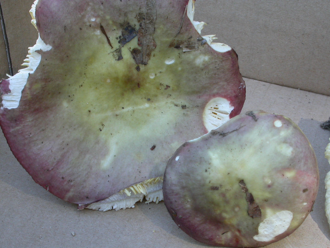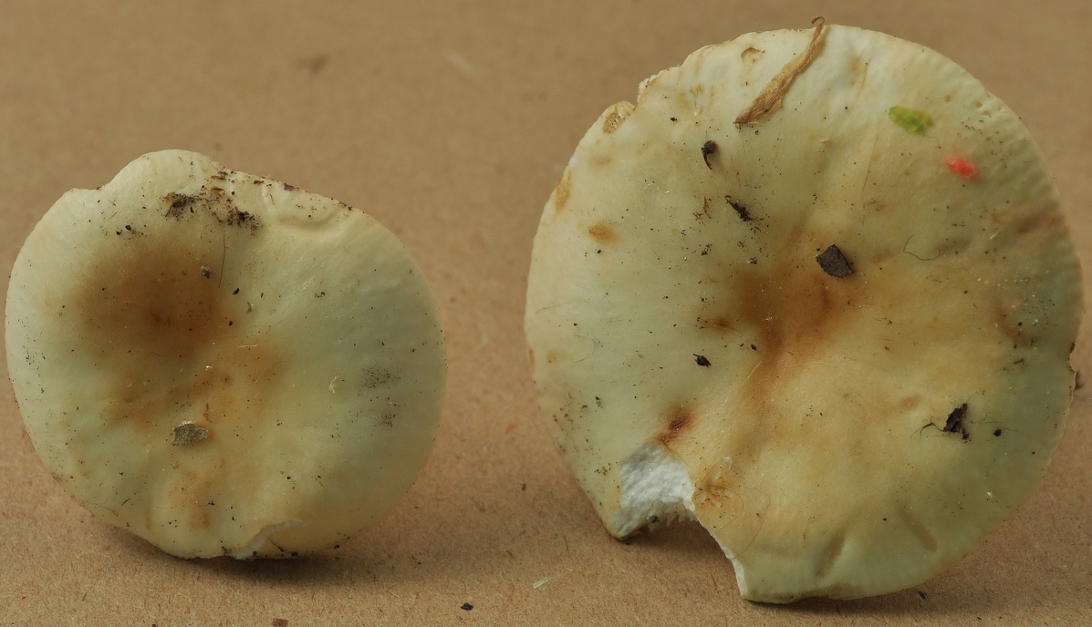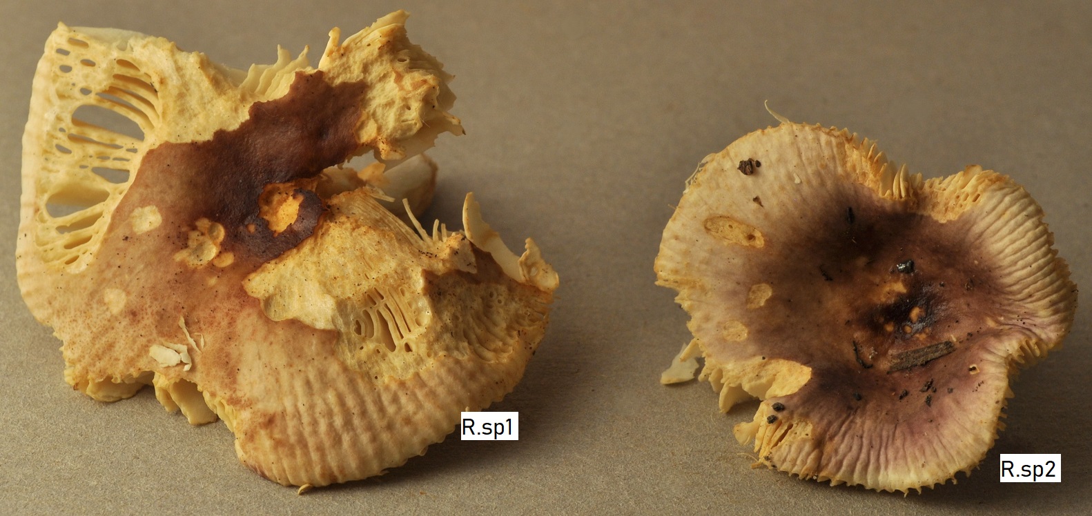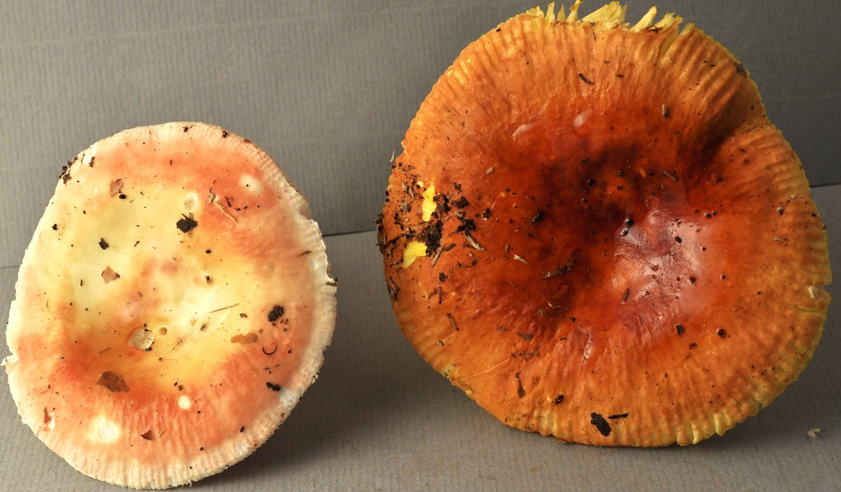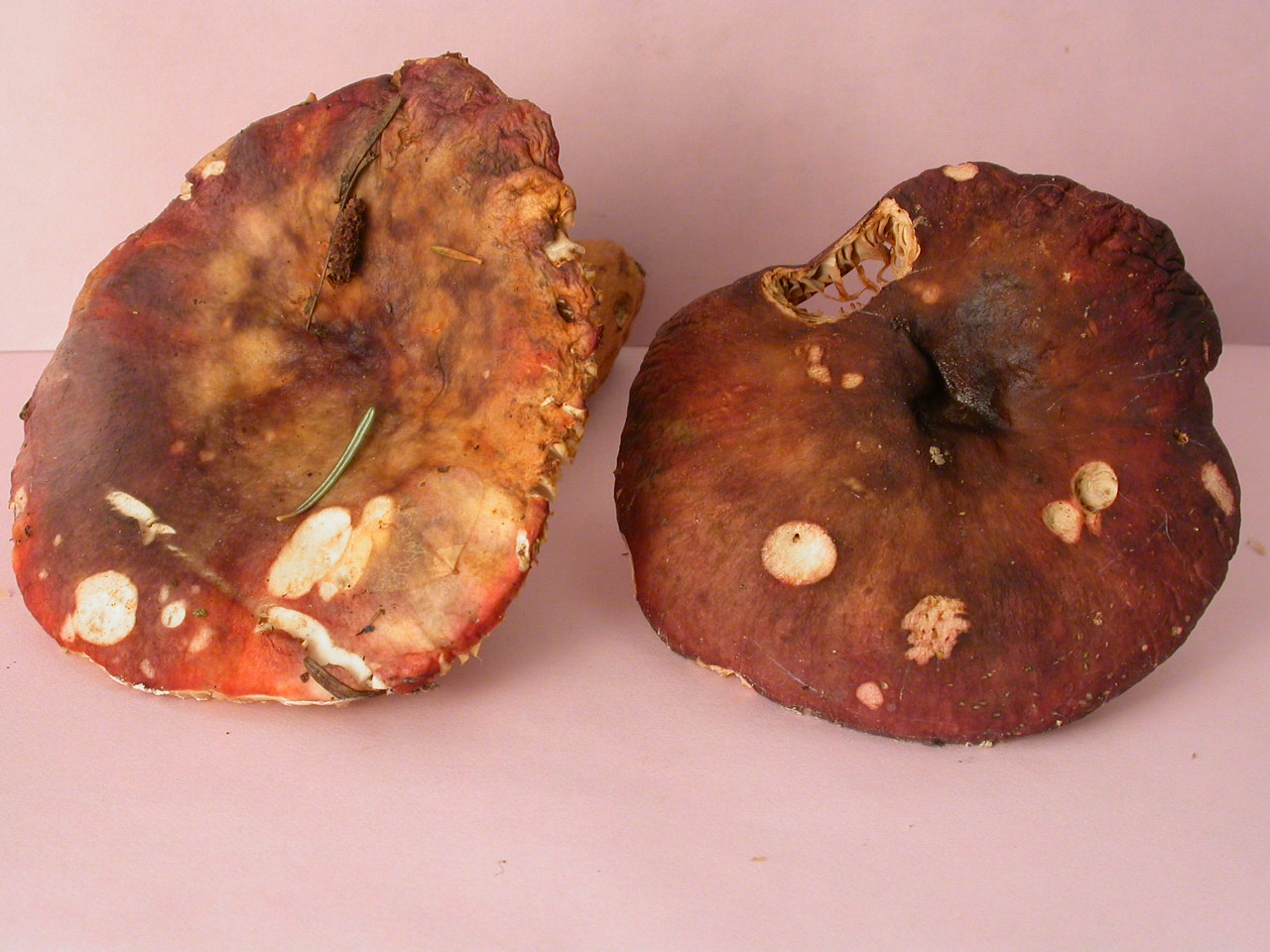 voir, CD8-F7 32. Φ 90 et 103 mm. Les couleurs du chapeau sont différentes, le rouge a disparu sur la deuxième par dilution, il reste qq teintes rougeâtres vers la marge. Lames âcres, l/t 6/10 mm, peu de chair vers la marge, chair seulement acrescente.