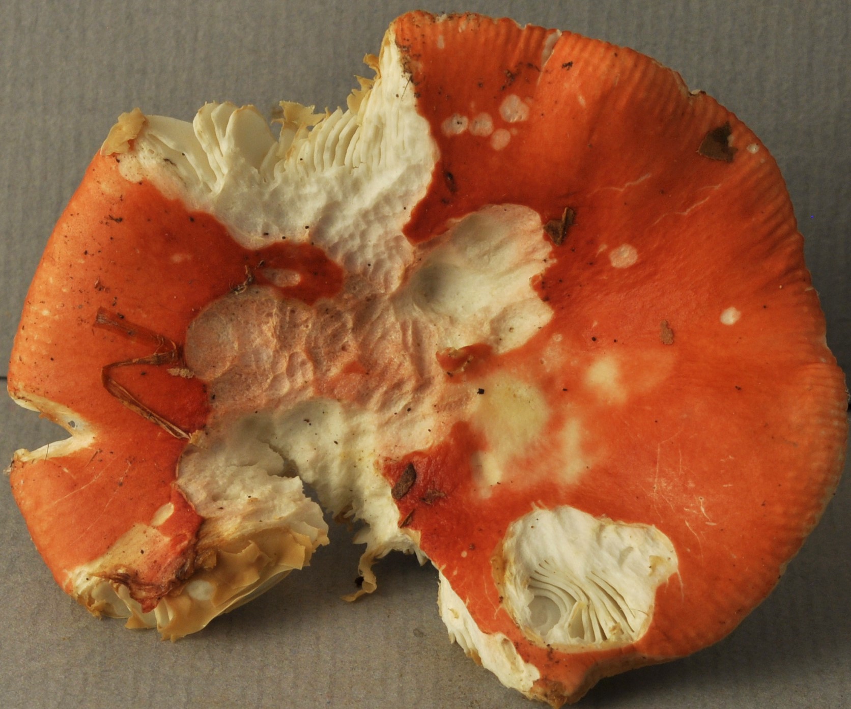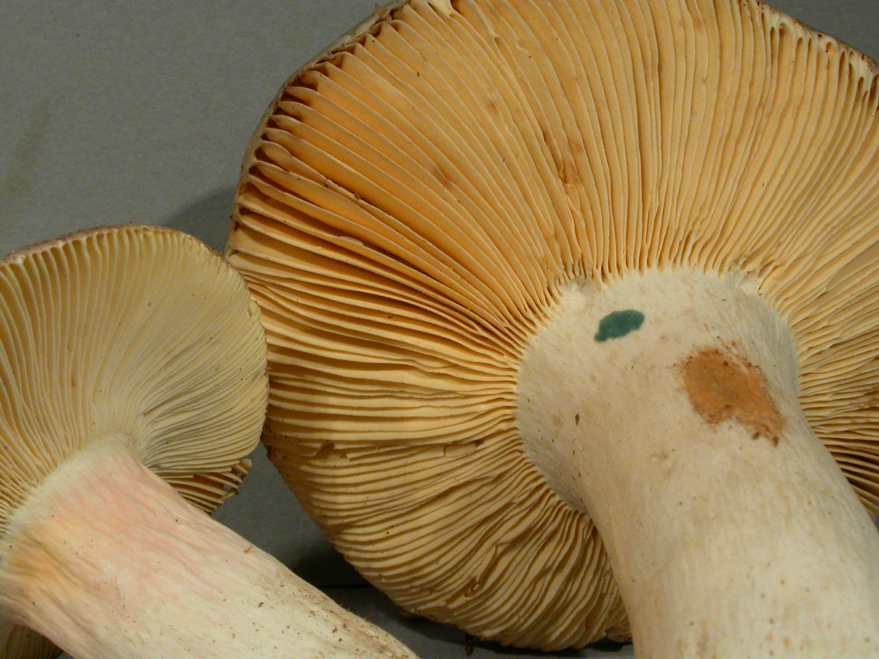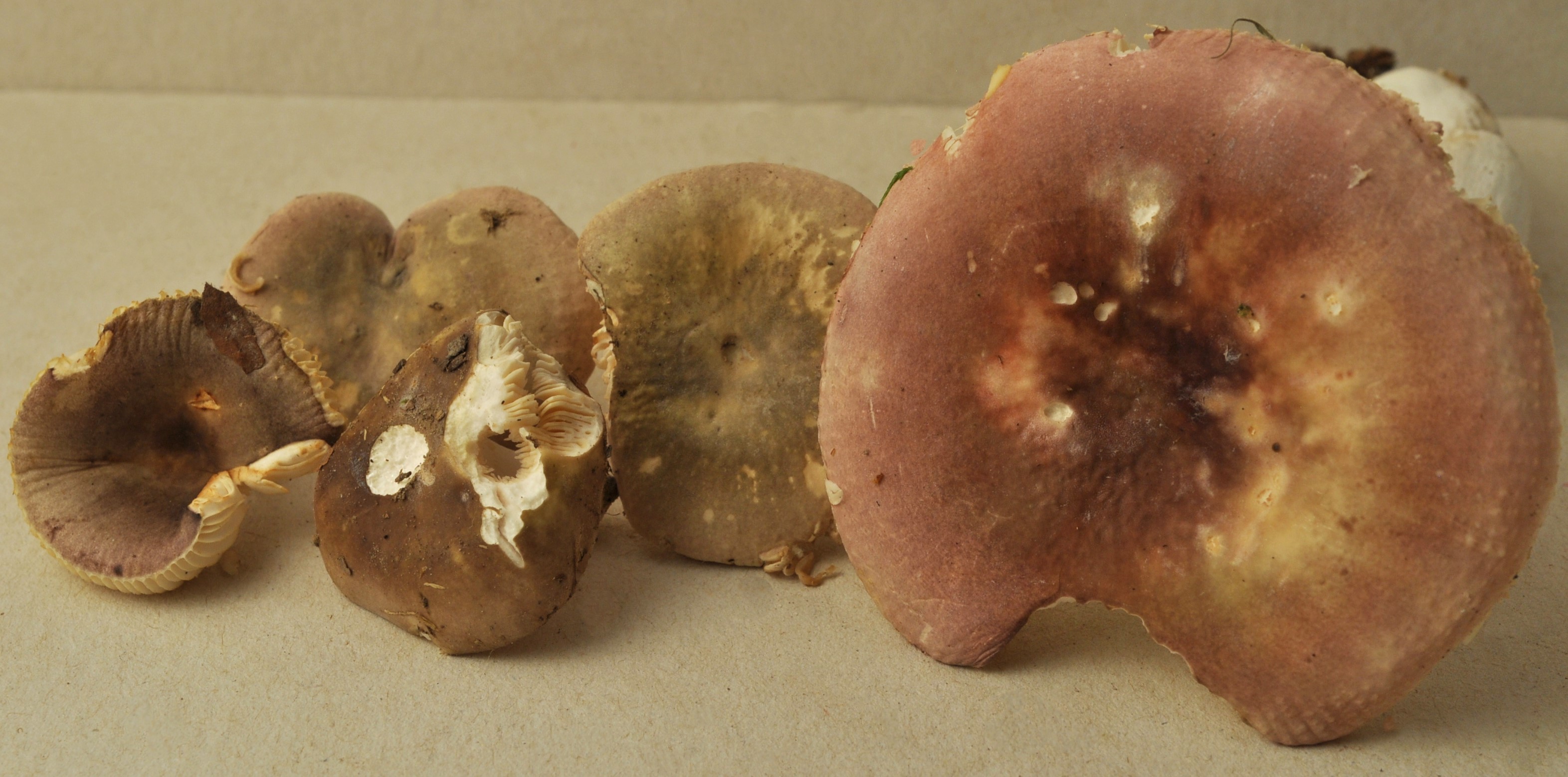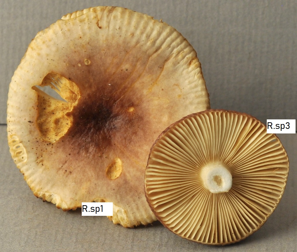voir, CD8-F7 32. Φ 90 et 103 mm. Les couleurs du chapeau sont différentes, le rouge a disparu sur la deuxième par dilution, il reste qq teintes rougeâtres vers la marge. Lames âcres, l/t 6/10 mm, peu de chair vers la marge, chair seulement acrescente.