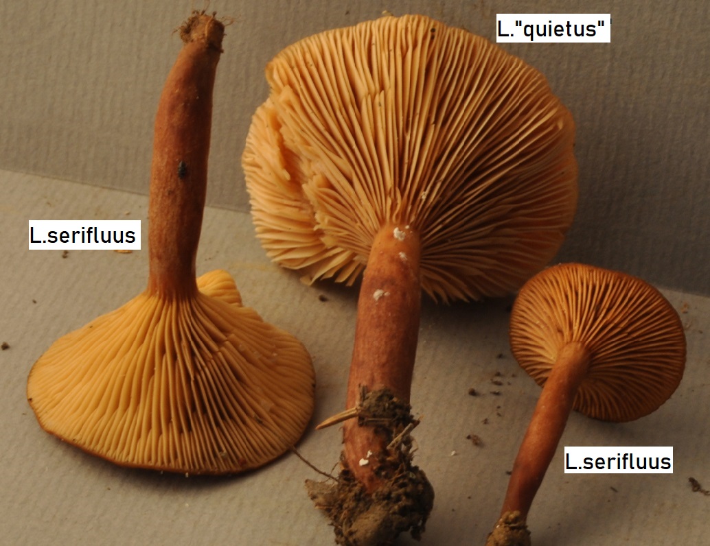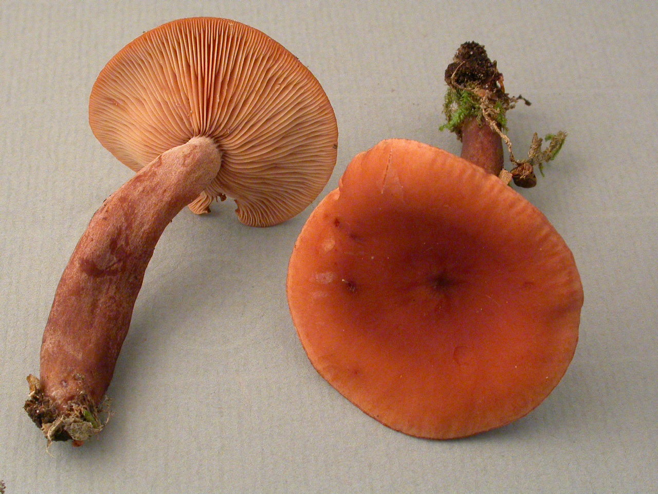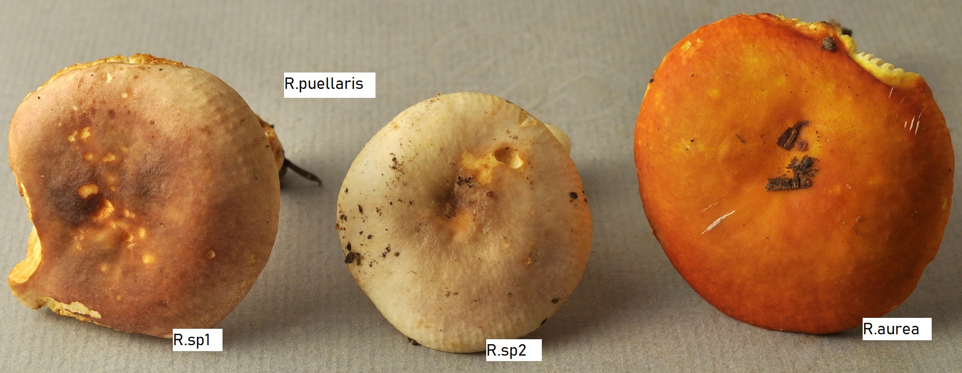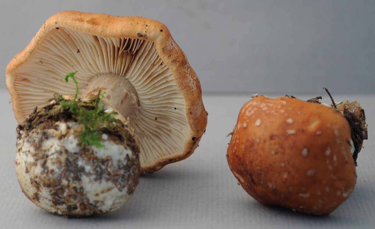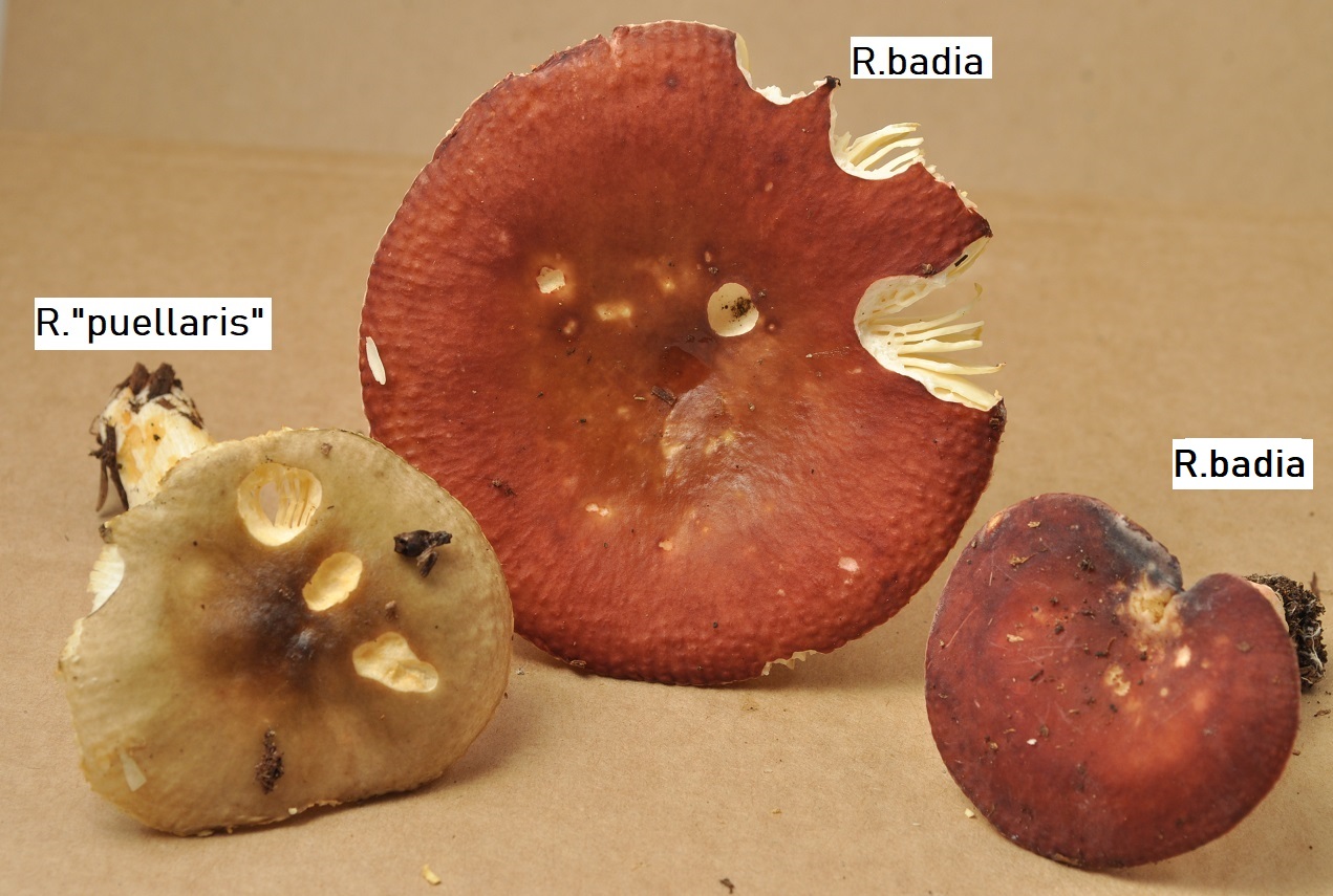 voir, CD8-F7 32. Φ 90 et 103 mm. Les couleurs du chapeau sont différentes, le rouge a disparu sur la deuxième par dilution, il reste qq teintes rougeâtres vers la marge. Lames âcres, l/t 6/10 mm, peu de chair vers la marge, chair seulement acrescente.