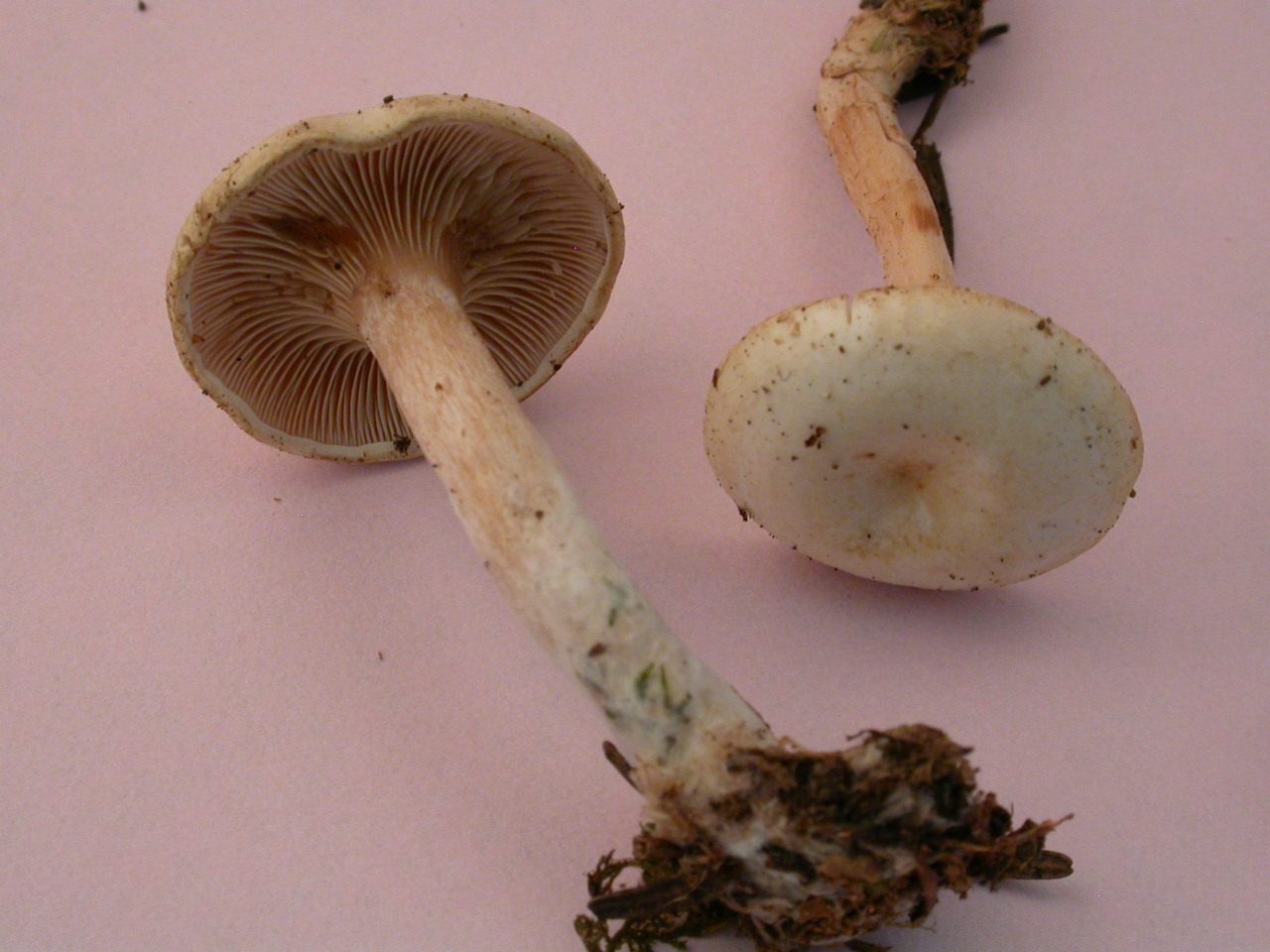 photo, CD8-F10 7. Chapeau convexe, blanchâtre. Stipe blanc (Φ 8 mm) avec rhizoïdes, voile membraneux, chair épaisse (l/t 4/9). Saveur amère. Trouvé dans l'herbe le long du chemin. Ressemble bien à Agrocybe molesta par la macro (chapeau blanc, chair épaisse, dans l'herbe) ou la micro (forme des cystides sur l'arête), mais il s'agit des plus petites spores rencontrées pour cette espèce et le pore germinatif est très peu visible.