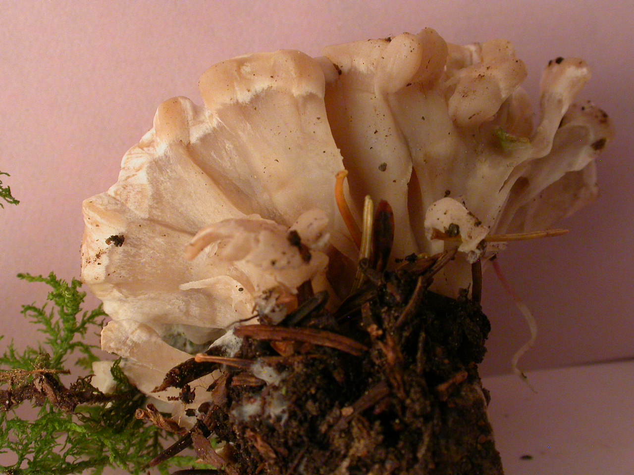 photo , CD8-F12 54. Fructification blanche (sparassis ?), feuillets très minces (~ 0.5 mm), saveur douce. Qq spores subglobuleuses, 9-10 x 7-8 μ. surface recto et verso (plus développée, semblant la partie fertile) très semblable. Eléments "cystidioïdes" émergent cylindriques ou subcapitées. Pas vu de spores dans la préparation, mais 2 types ont sporulés, a sporulé, voir Sparassis sp., face fertile et face non fertile semble se différentier par les cystides, émergentes et plus larges sur la première, cloisons non bouclées..