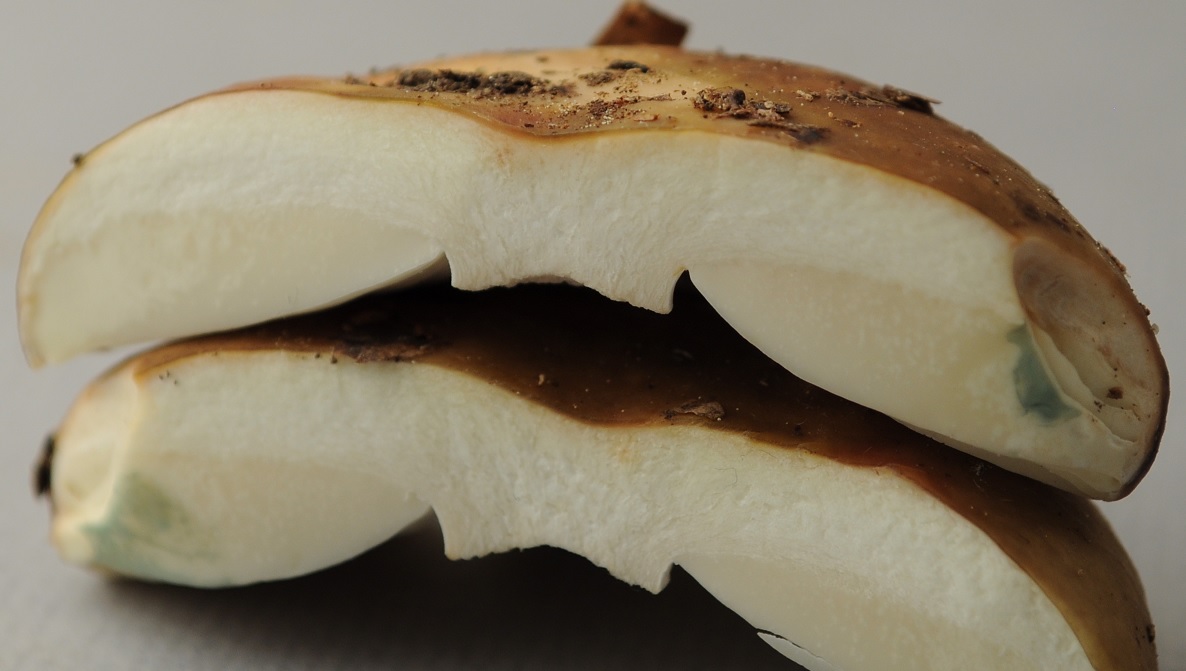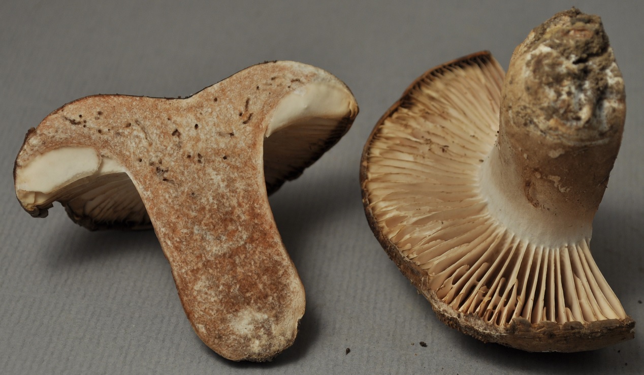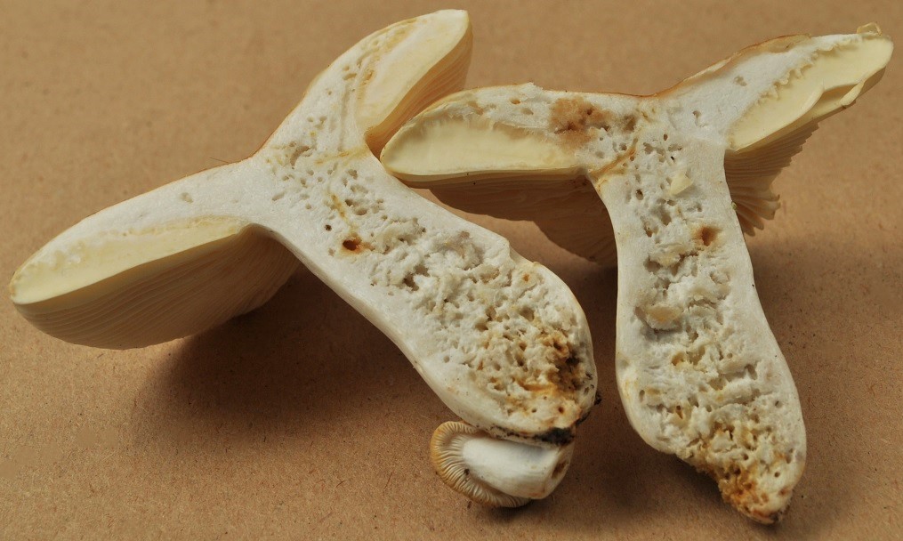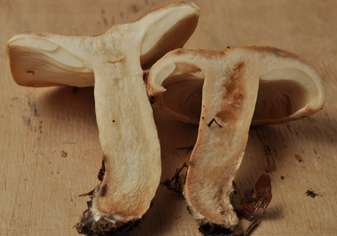 la station, CD8-F5 24/30. En nombre sur les copeaux autour d'un hortensia (Φ jusqu'à 50 mm). Saveur amère (lames et chair). Notez la chair sombre et les lames colorées.