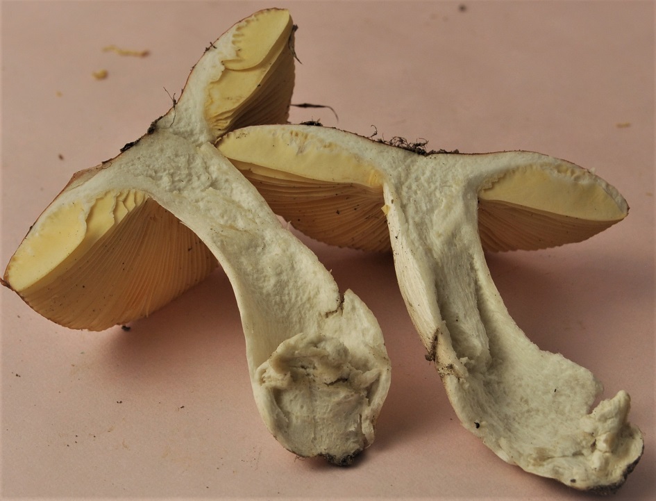 coupe, CD8-F11 136/137. Sporée jaune clair. Lames jaune-pâles, qq fourchues et lamellules. Stipe ridulé avec nuances de rouge, jaunissant. Fe vert. Odeur de crustacées. Ga S+++ L+++ C+++.