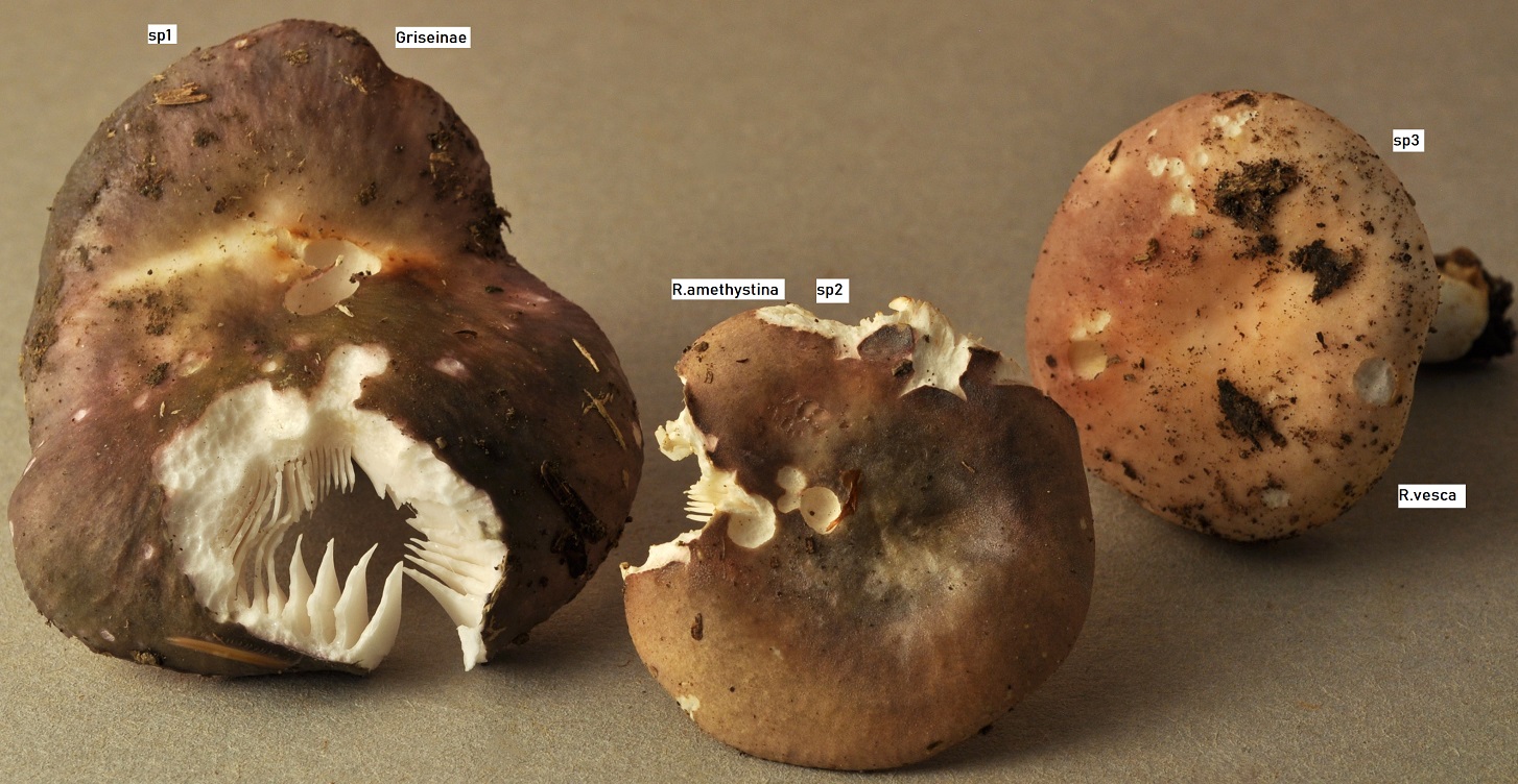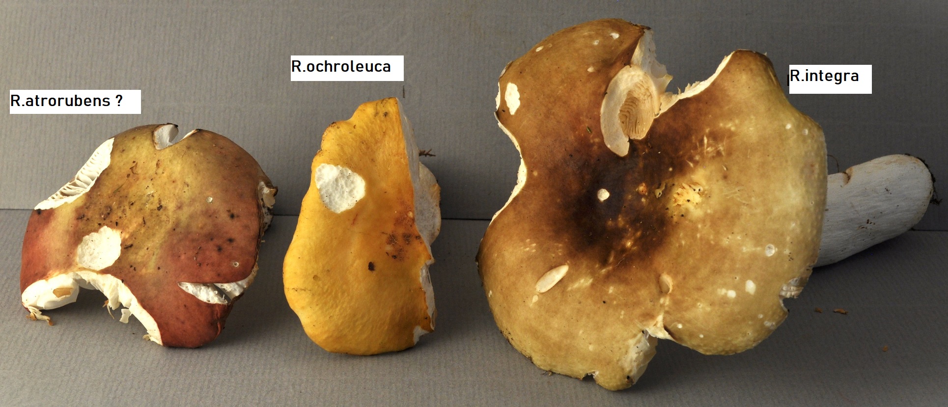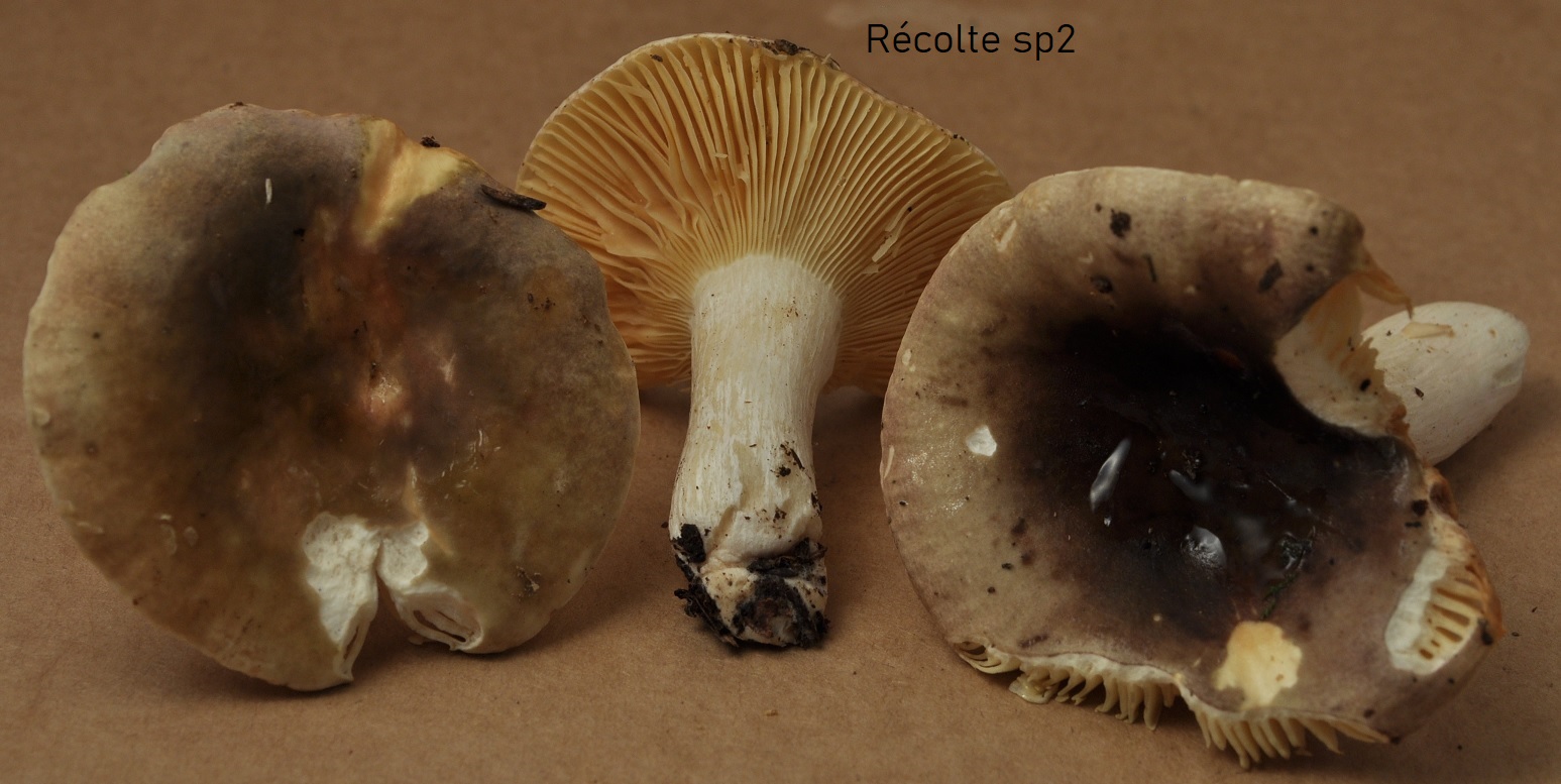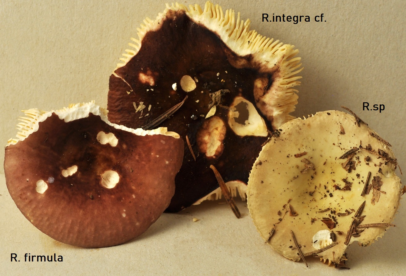 13/9/20, Col de Porte, micro 2450, fut sp1, 4 ex. Φ 72 à 95 mm, Avec les autres Russula du jour), CD8-F3 29. De gauche à droite et d'arrière en avant: R.sp1 (R.viscida), R.sp2 (R.badia), R.sp3 (gr. integra ), R.sp4 (R."emetica "), R.sp5 (R.puellaris ou R.cavipes ?). dessous et coupe, CD8-F3 33, Comparaison en coupe, CD8-F3 35. Photo en coupe des 3 russules à chapeau brun pourpre, respectivement R.viscida, R.badia, R.integra cf. 2 caractéristiques qui peuvent permettre d'avancer dans une différentiation: forme des lames et réaction au Gaiac. R.viscida a des lames étroites par rapport aux 2 autres. La réaction au Gaiac a été noté: R.viscida C++ (5"), R.badia C0 (20 "), R.integra cf. C+++ (2"). Stipe jaunissant en bas. Lames crèmes (l/t 6/11 mm), adnées, anastomosées, fourchues vers le pied. Ga S+ (5") C+ (5"), KOH rouge (sur parties jaunissantes), orange (cuticule). Saveur âcre (lames), acrescente (chair).