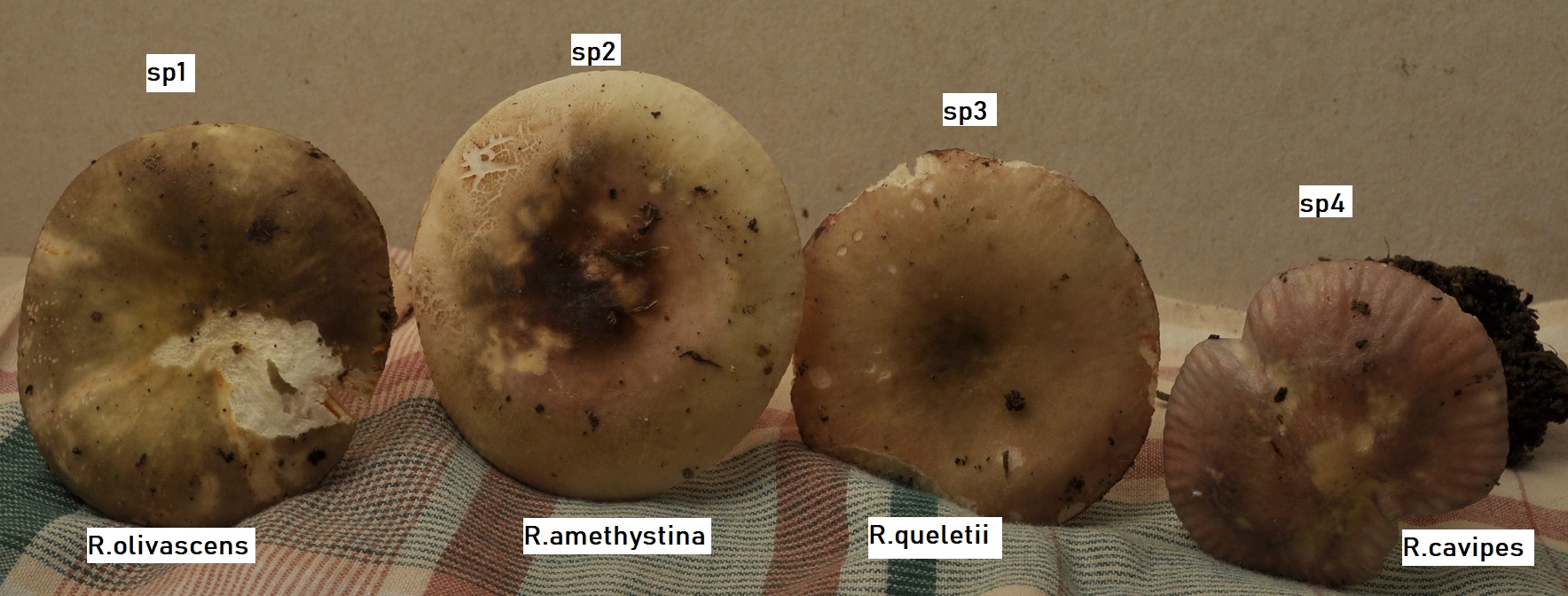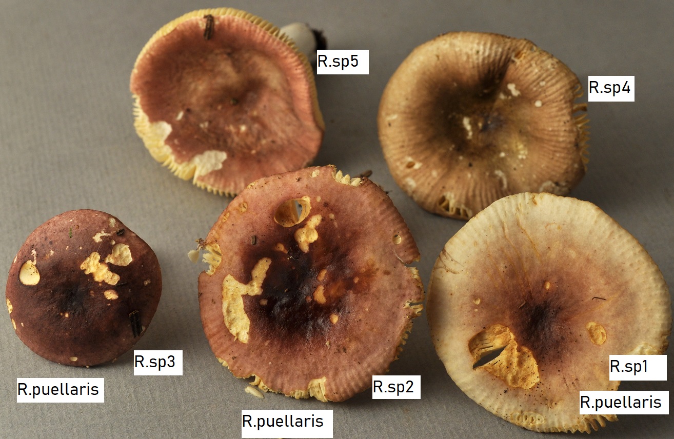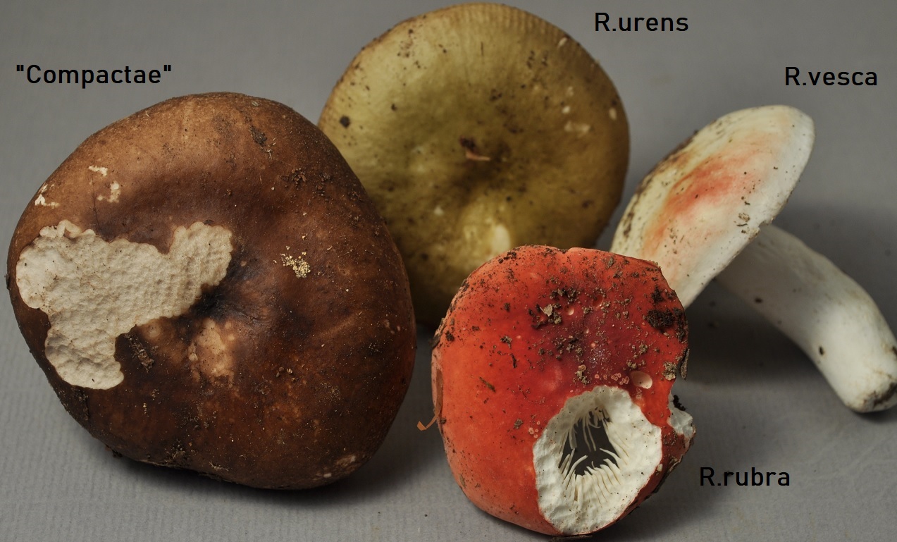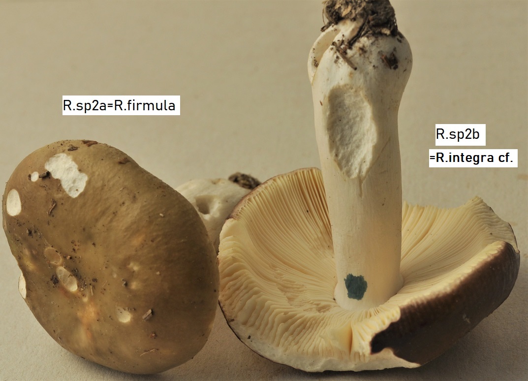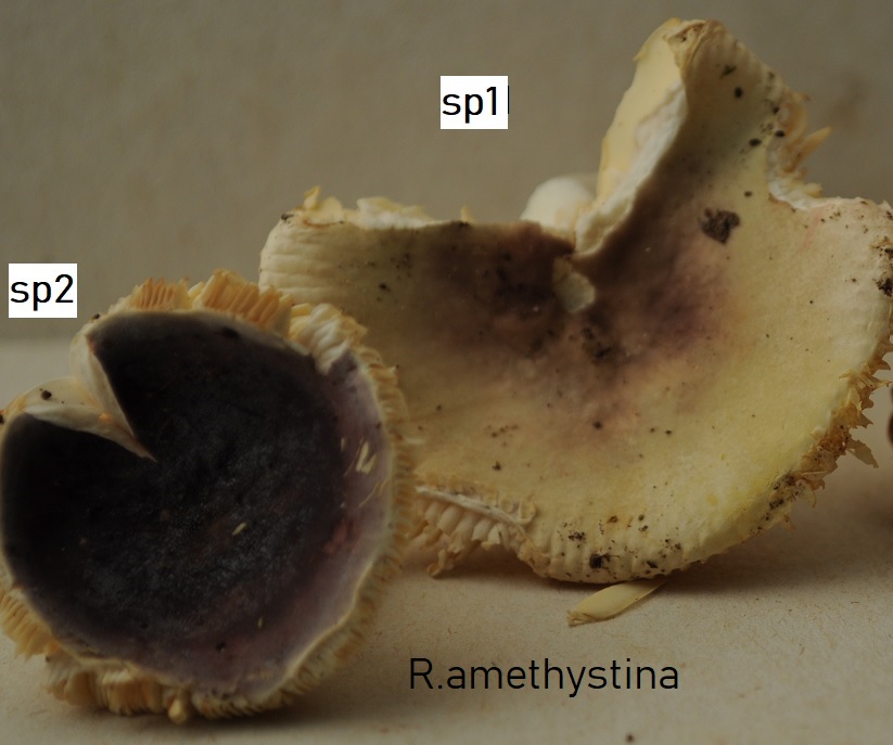 13/9/20, Col de Porte, micro 2450, fut sp1, 4 ex. Φ 72 à 95 mm, Avec les autres Russula du jour), CD8-F3 29. De gauche à droite et d'arrière en avant: R.sp1 (R.viscida), R.sp2 (R.badia), R.sp3 (gr. integra ), R.sp4 (R."emetica "), R.sp5 (R.puellaris ou R.cavipes ?). dessous et coupe, CD8-F3 33, Comparaison en coupe, CD8-F3 35. Photo en coupe des 3 russules à chapeau brun pourpre, respectivement R.viscida, R.badia, R.integra cf. 2 caractéristiques qui peuvent permettre d'avancer dans une différentiation: forme des lames et réaction au Gaiac. R.viscida a des lames étroites par rapport aux 2 autres. La réaction au Gaiac a été noté: R.viscida C++ (5"), R.badia C0 (20 "), R.integra cf. C+++ (2"). Stipe jaunissant en bas. Lames crèmes (l/t 6/11 mm), adnées, anastomosées, fourchues vers le pied. Ga S+ (5") C+ (5"), KOH rouge (sur parties jaunissantes), orange (cuticule). Saveur âcre (lames), acrescente (chair).