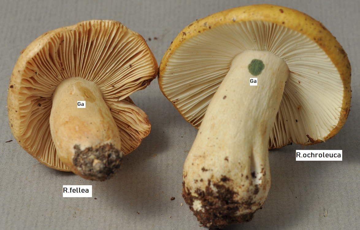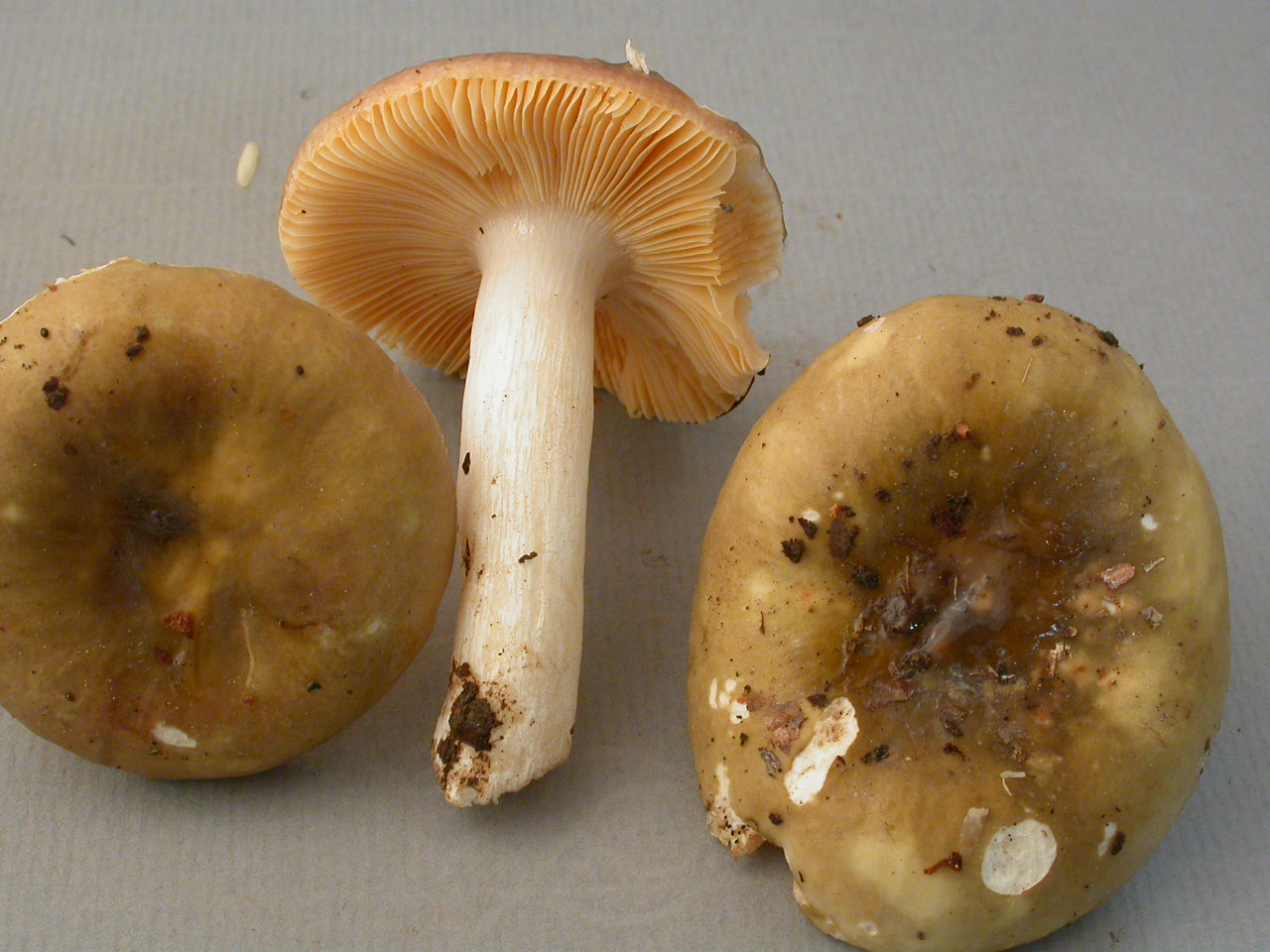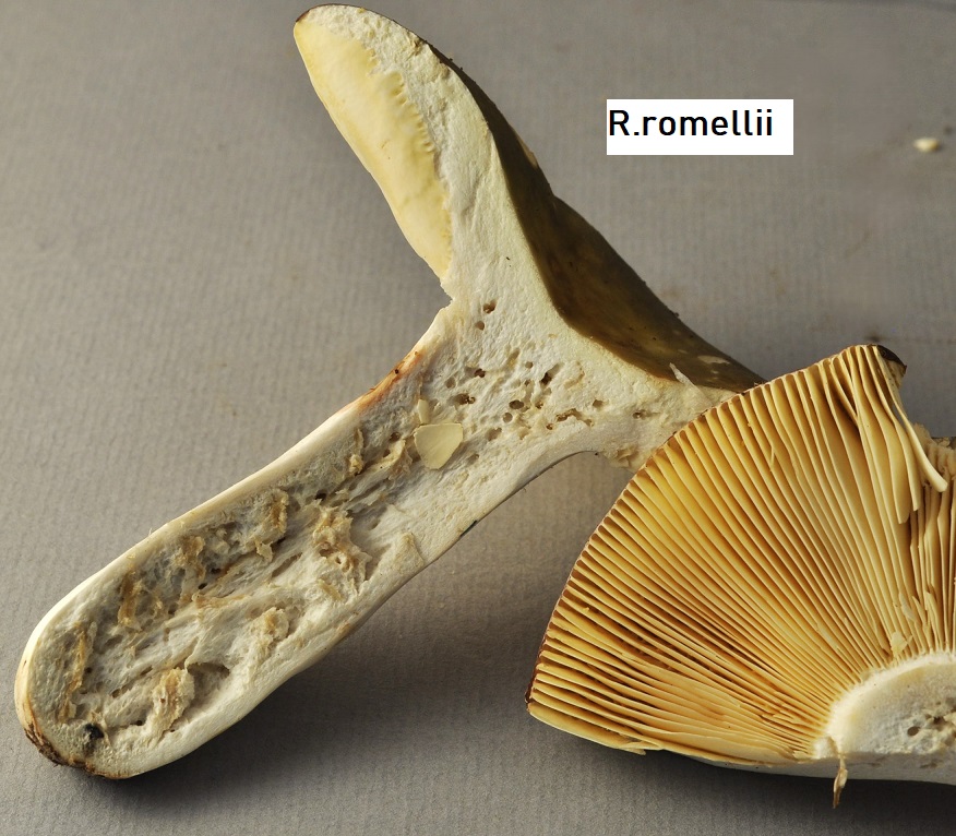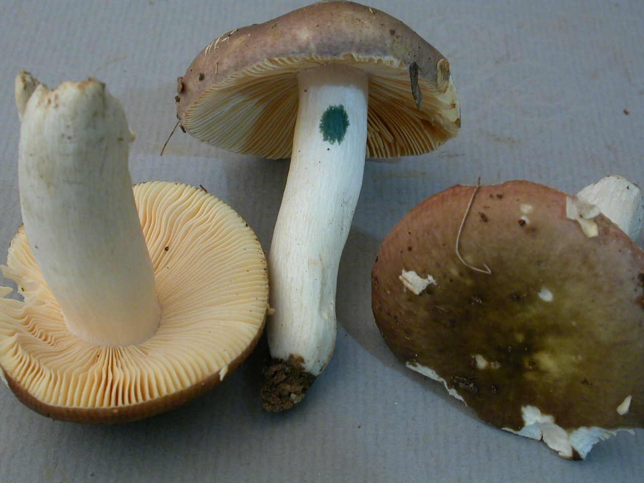 coupe, CD8-F11 17/19. Chapeau ocre brun, rappelant "R.mustelina" (bonne ressemblance avec Galli-373 R.xerampelina var. fuscoochracea). Stipe ridé, pruineux en haut, vite brunissant. Lames jaune-ocre, serrées, émarginées, qq fourchues. Ga S++ C++, Fe vert sombre rapidement. Forte odeur nauséeuse.