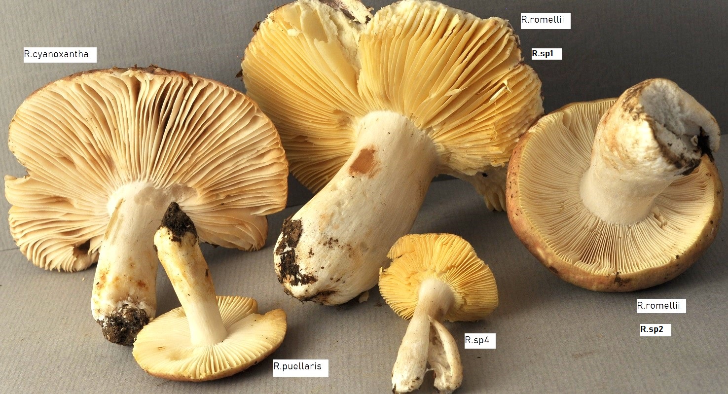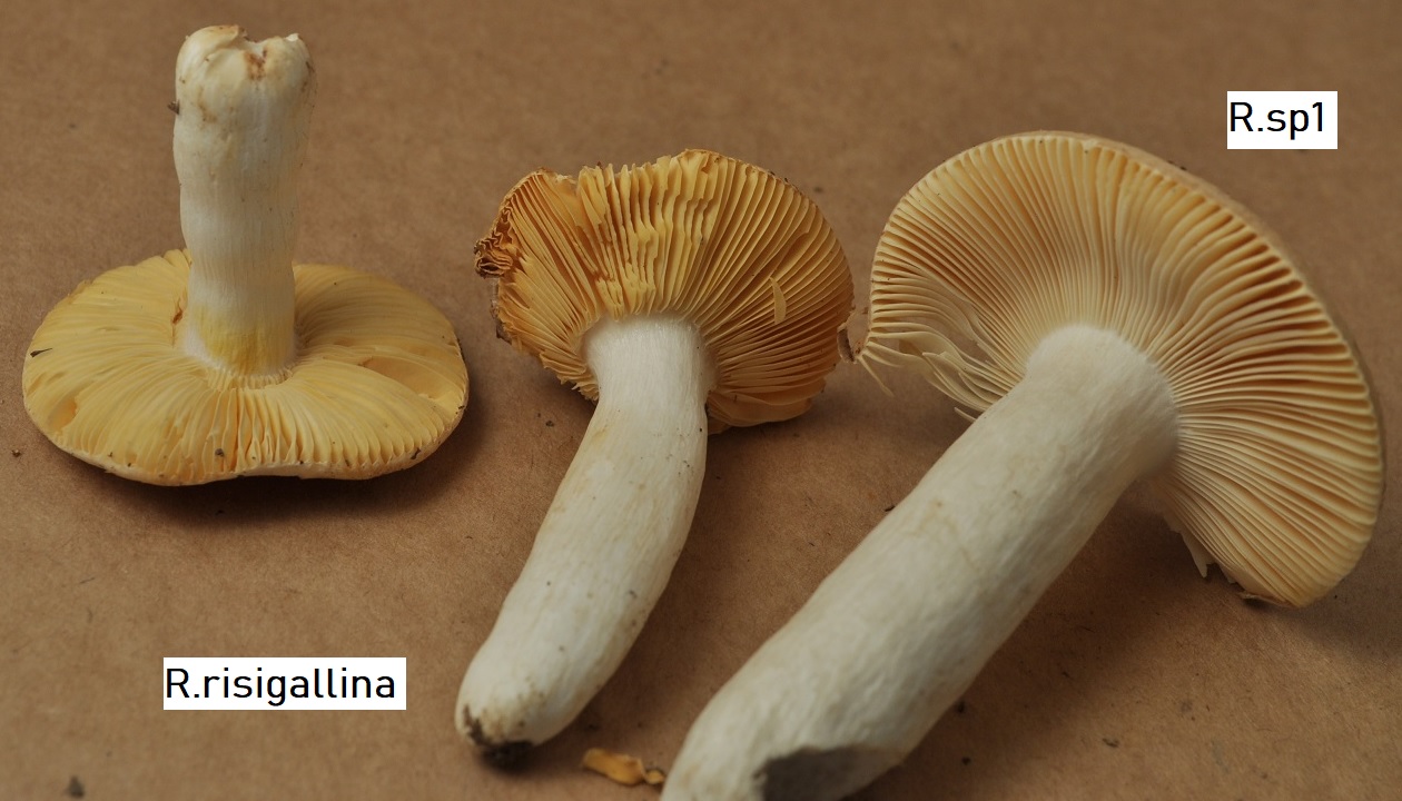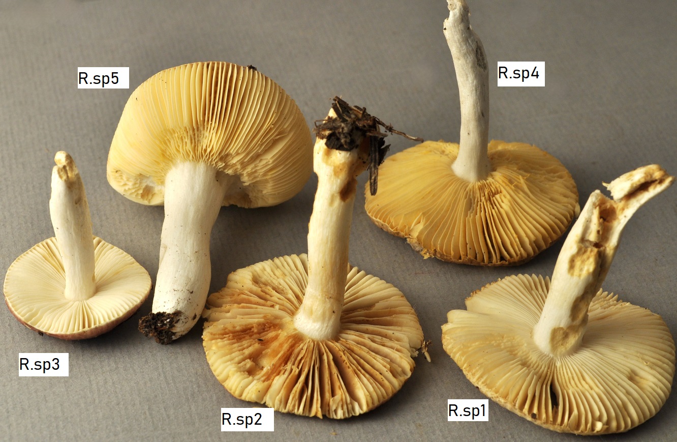 coupe, CD8-F11 17/19. Chapeau ocre brun, rappelant "R.mustelina" (bonne ressemblance avec Galli-373 R.xerampelina var. fuscoochracea). Stipe ridé, pruineux en haut, vite brunissant. Lames jaune-ocre, serrées, émarginées, qq fourchues. Ga S++ C++, Fe vert sombre rapidement. Forte odeur nauséeuse.