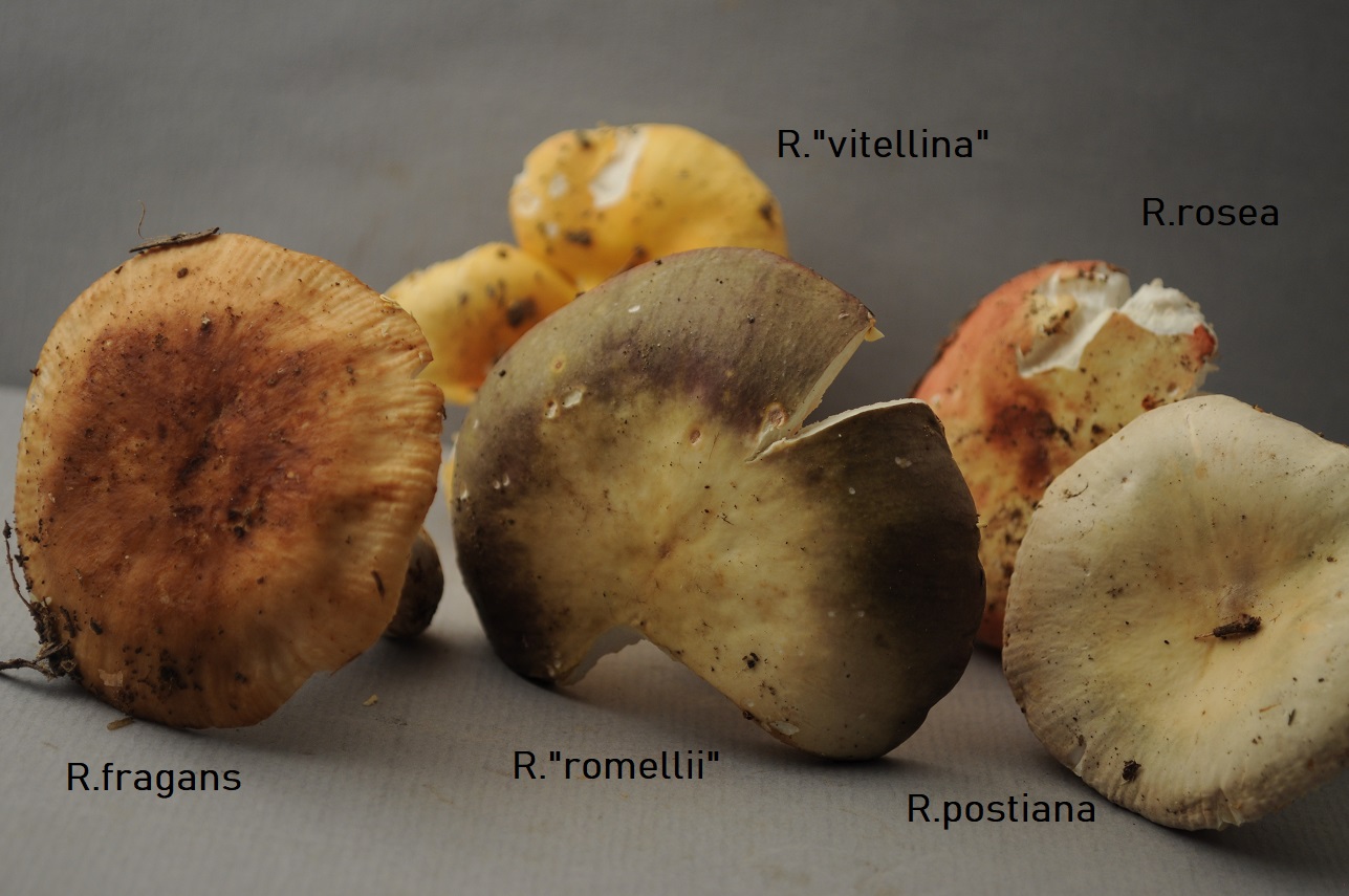 Avec des spores subglobuleuses à ornementation pseudoréticulée très basse, les lames crèmes, le fort brunissement du bas du stipe, la réaction forte avec le Gaiac, on peut penser à R.melliolens. Pour les mêmes raisons R.rubra pourrait être une autre hypothèse. Au final on préférera R.viscida pour l'écologie, la réaction rouge avec KOH sur le bas du pied.. Critère important, la saveur n'a pas été testé vu l'état de la Russule.