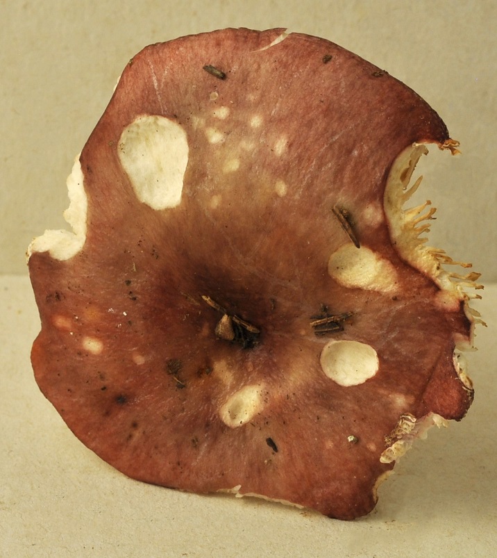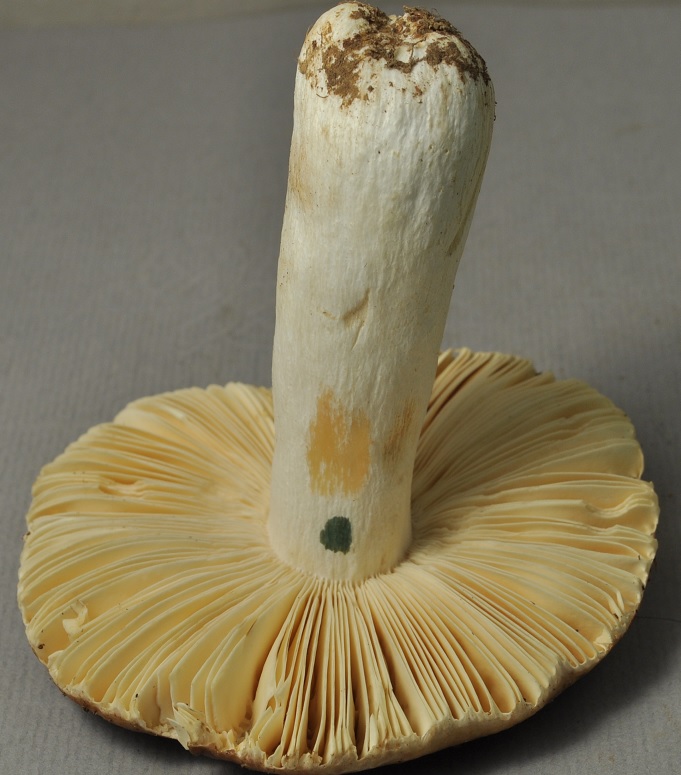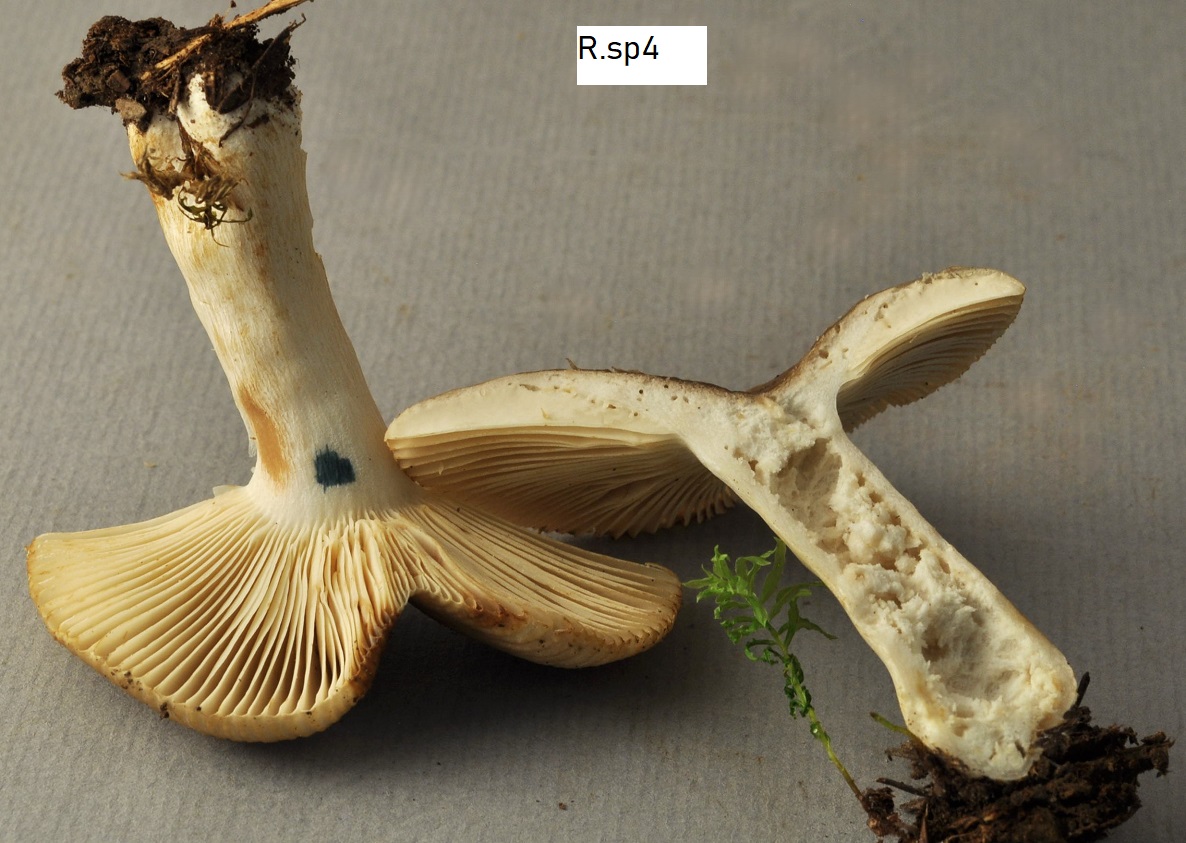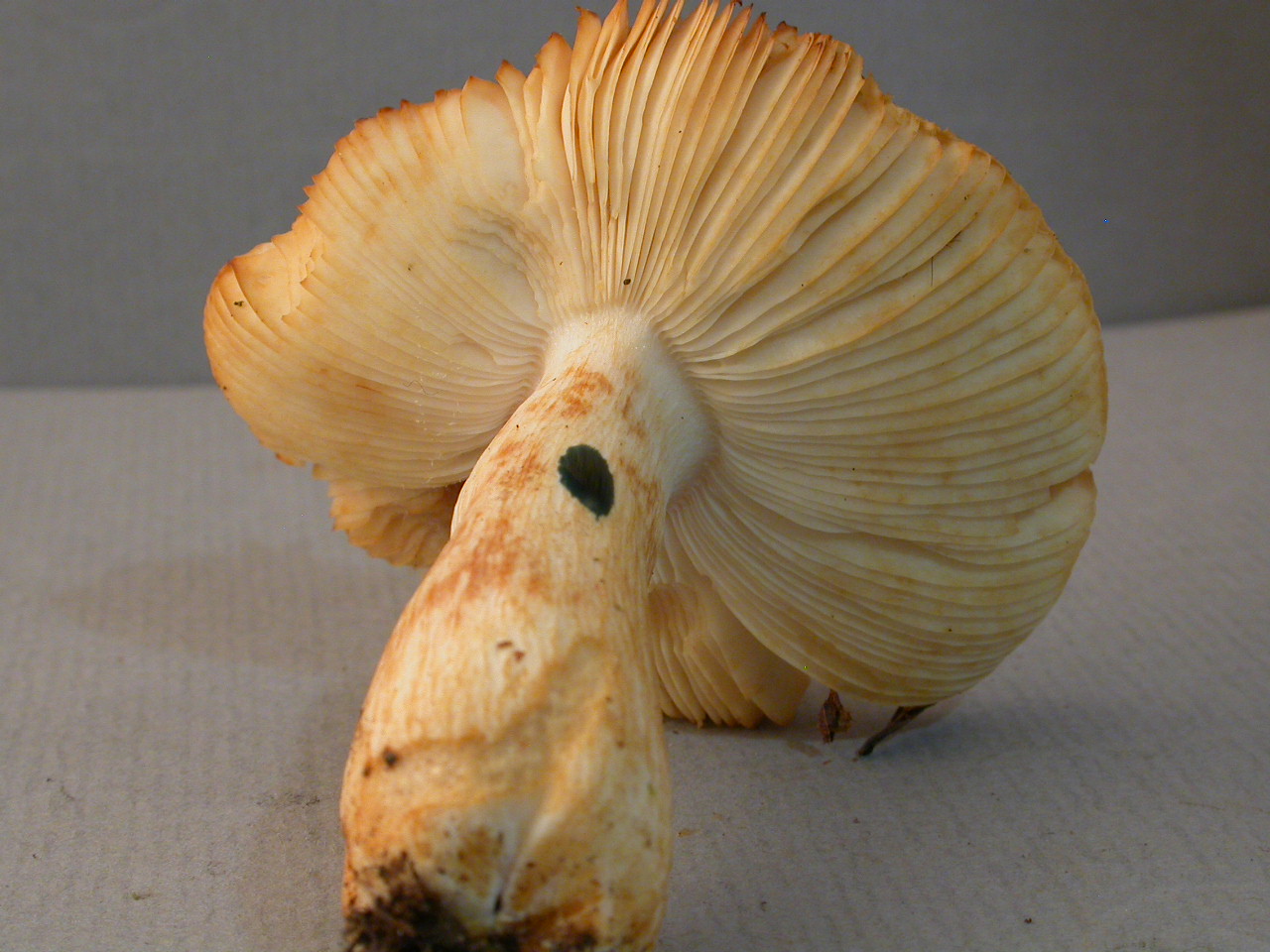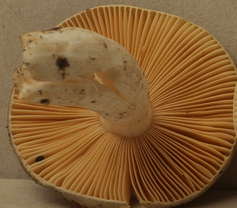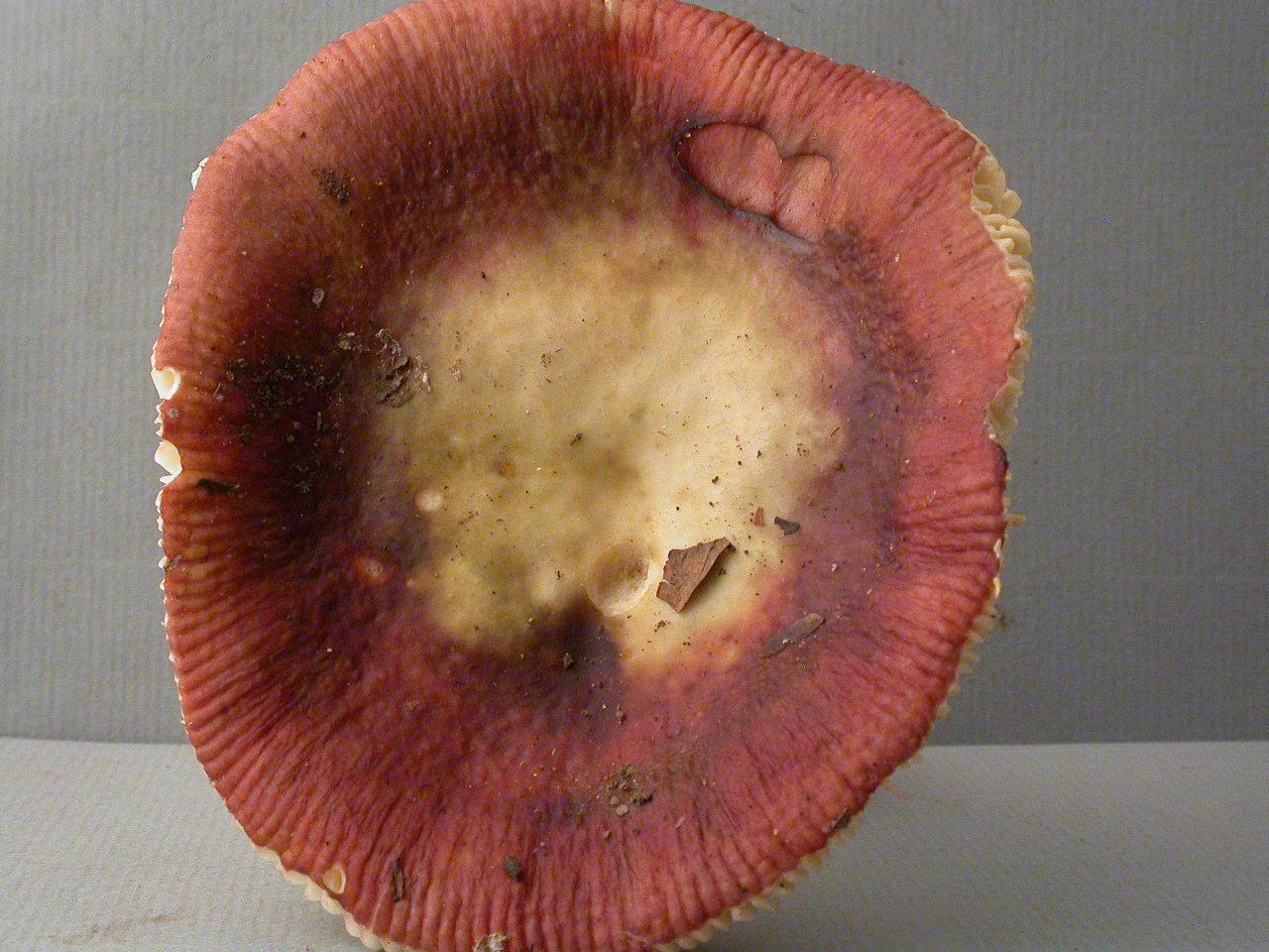 dessous , CD8-F12 50/51. Stipe blanchâtre, lames blanches, denses, lamellules, fourchues au niveau du stipe, chair dure. Lames crèmes en séchant. Ga S+++, Fe jaune orange (< 10"). Microspores 6 x 5 μ compatibles R.vesca mais recherche de crins négatives.