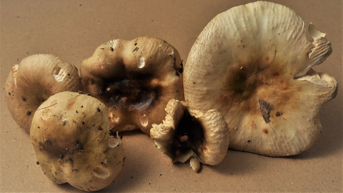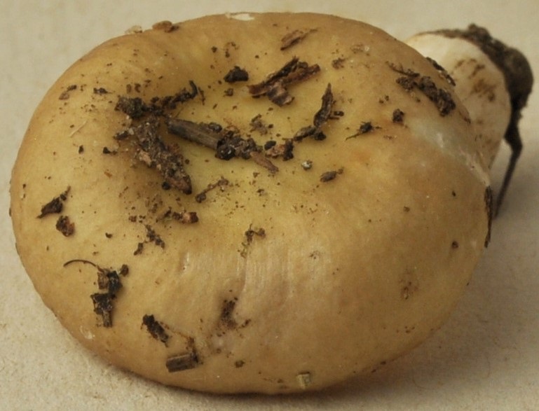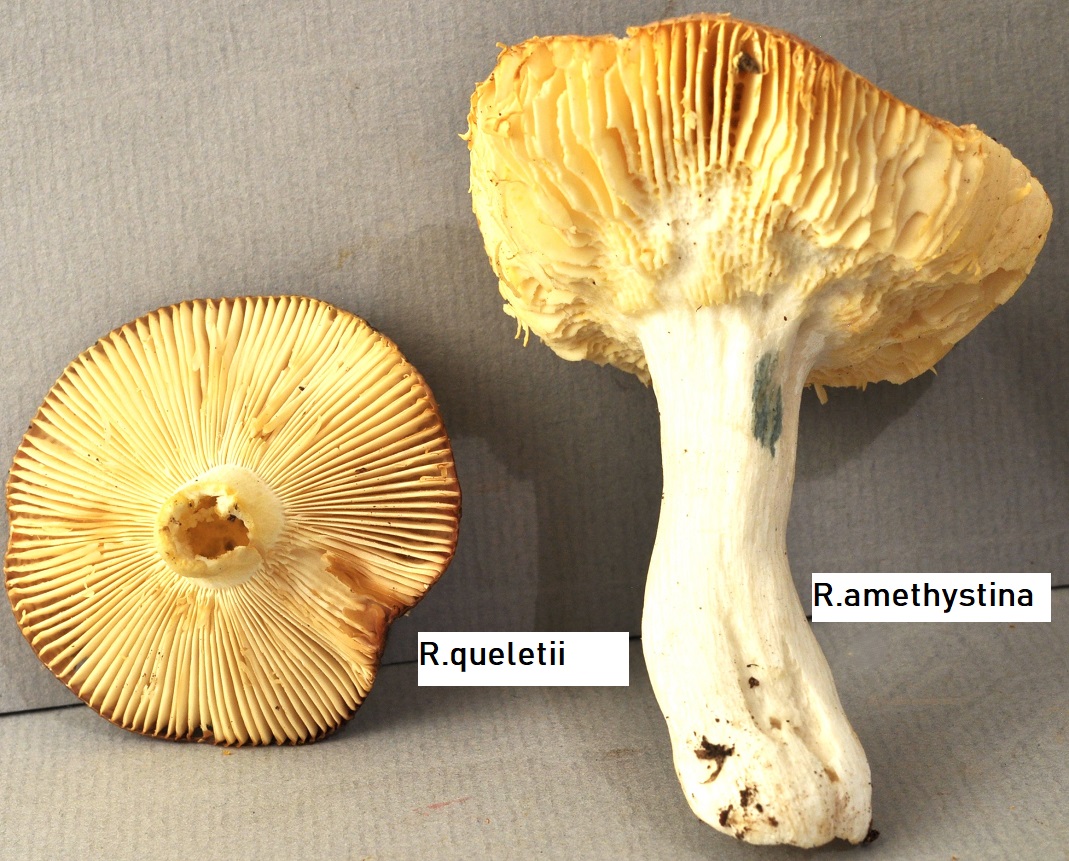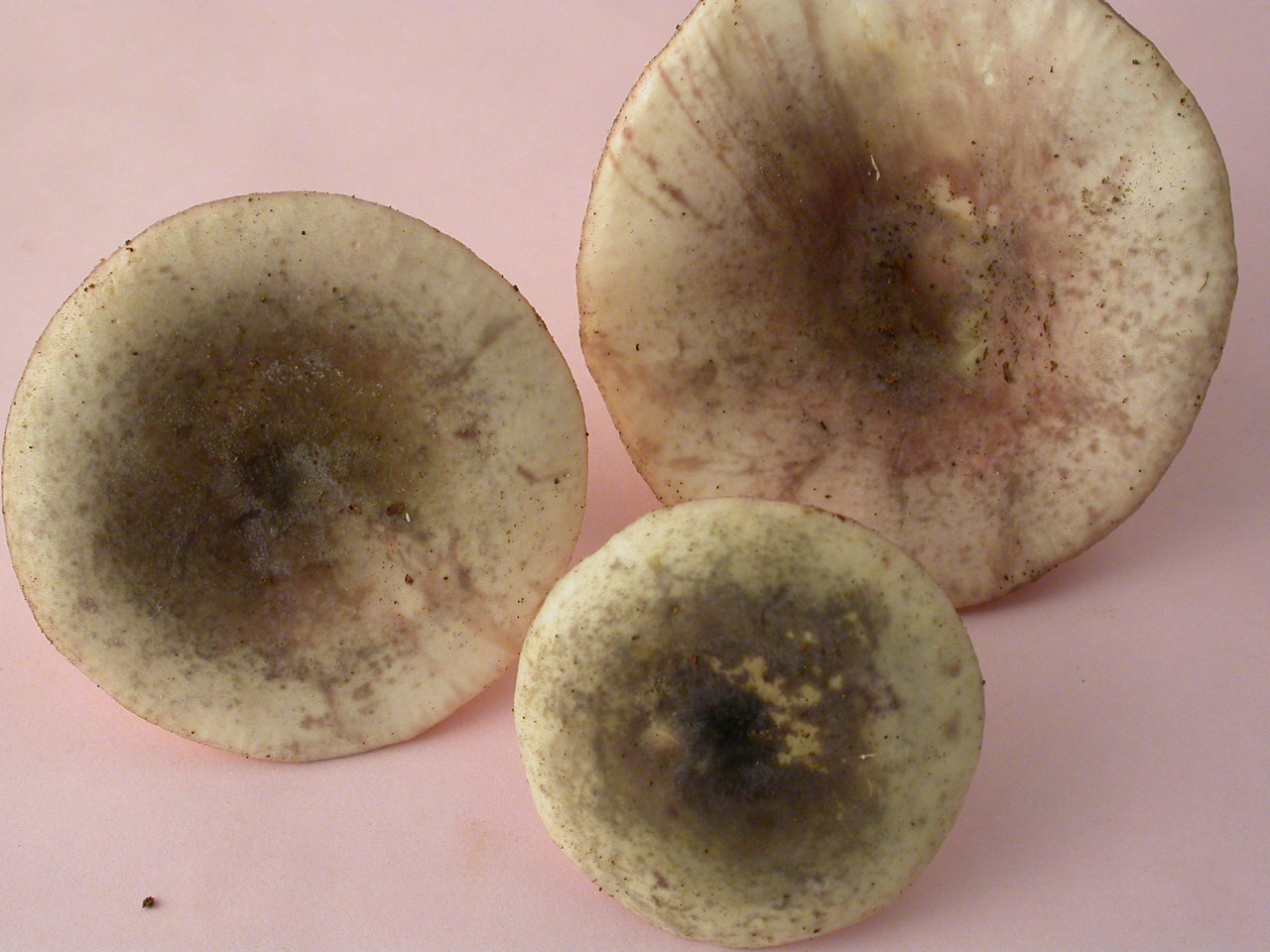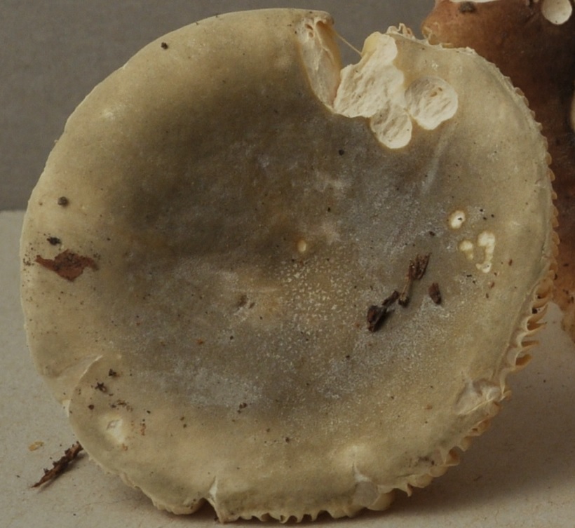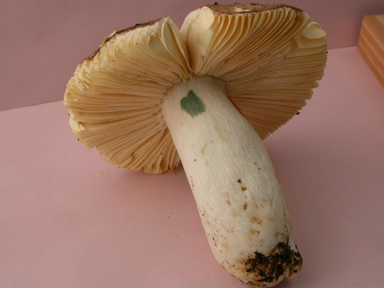 dessous , CD8-F12 50/51. Stipe blanchâtre, lames blanches, denses, lamellules, fourchues au niveau du stipe, chair dure. Lames crèmes en séchant. Ga S+++, Fe jaune orange (< 10"). Microspores 6 x 5 μ compatibles R.vesca mais recherche de crins négatives.