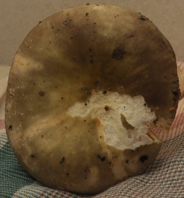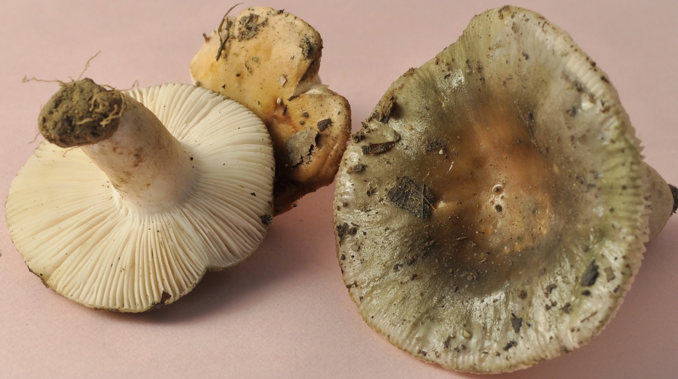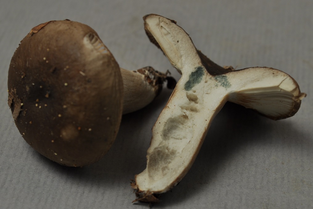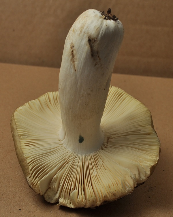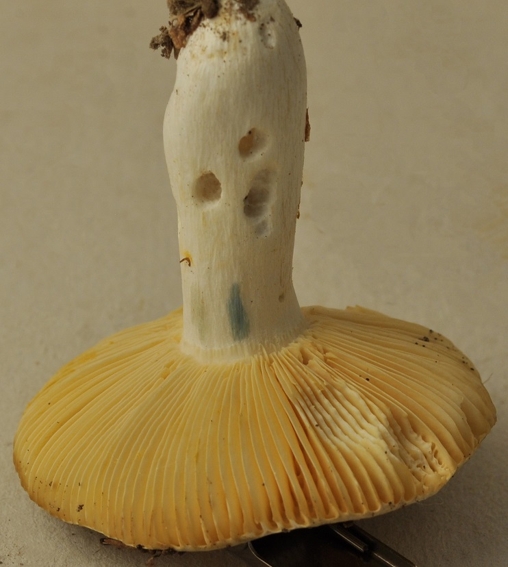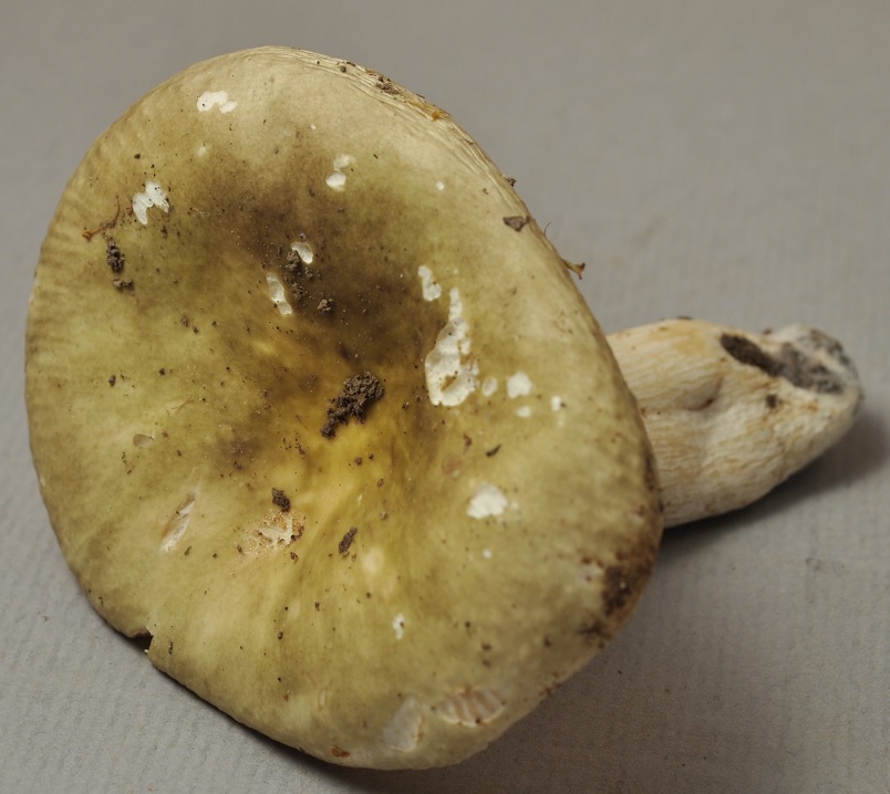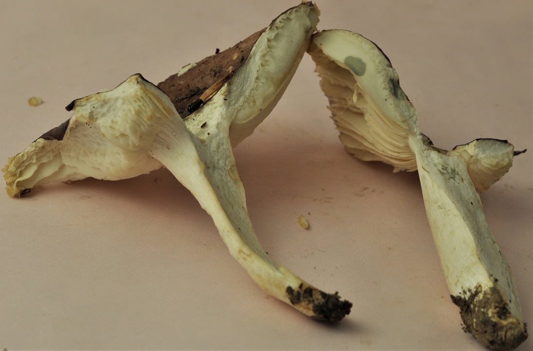 dessous, CD8-F11 100/101. Chapeau verdâtre-bleuâtre avec des plages ochracées. Lames émarginées, dentelées. Stipe pruineux en haut, restes de voile noirâtre, dessous, bas du pied bleuâtre-verdâtre.