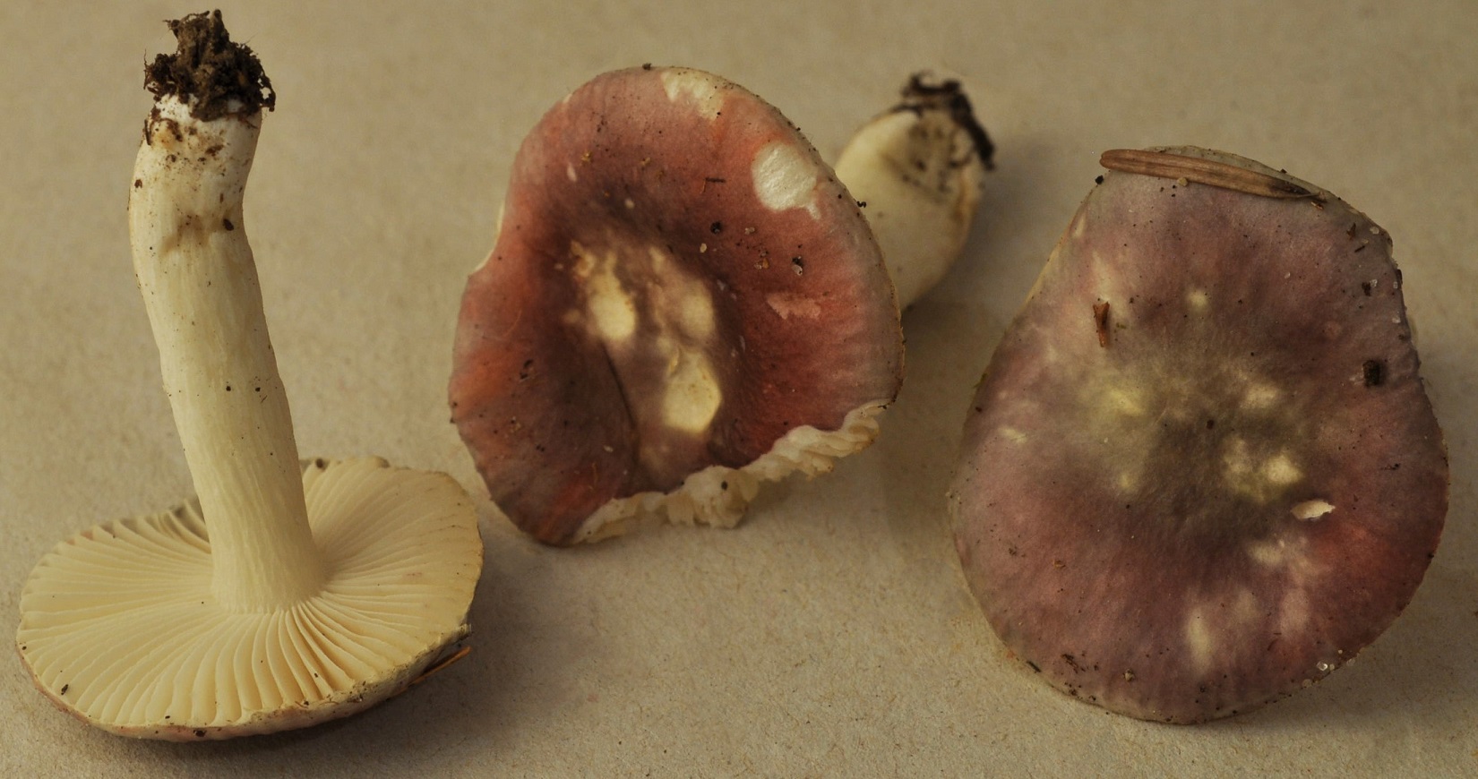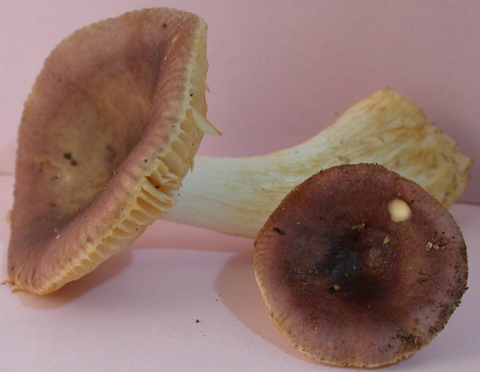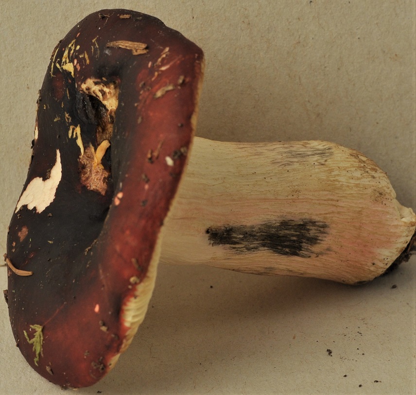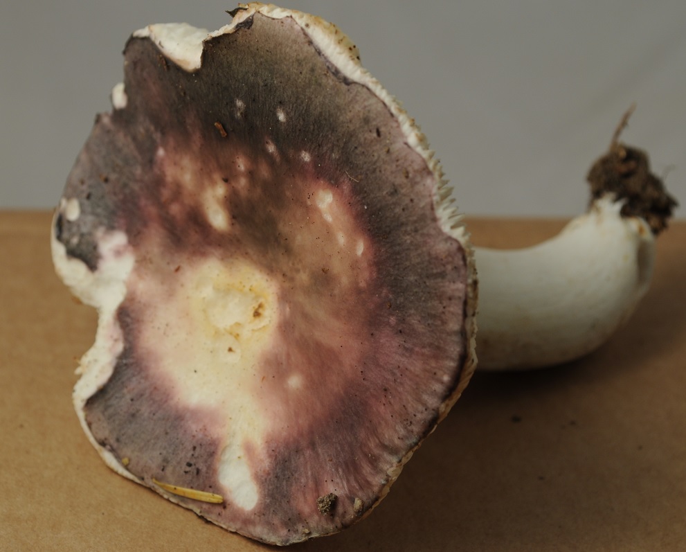 dessous, CD7-3 33/35. Chapeau pourpre brunâtre uniforme. Lames crèmes. Stipe fortement salissant dans le bas. KOH rouge bas du stipe. Ga S+++ L+++.
