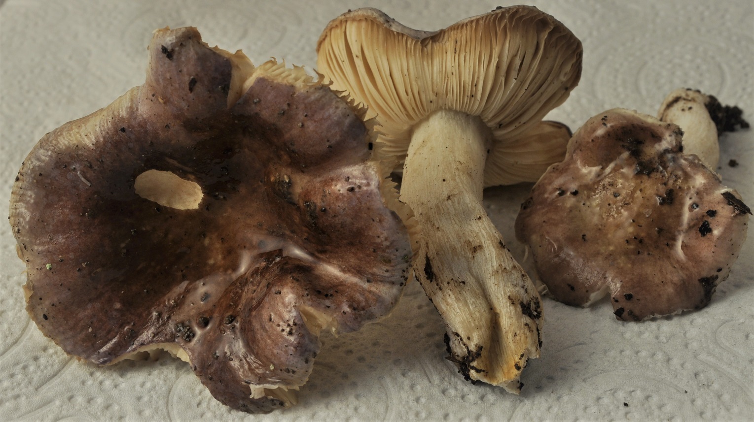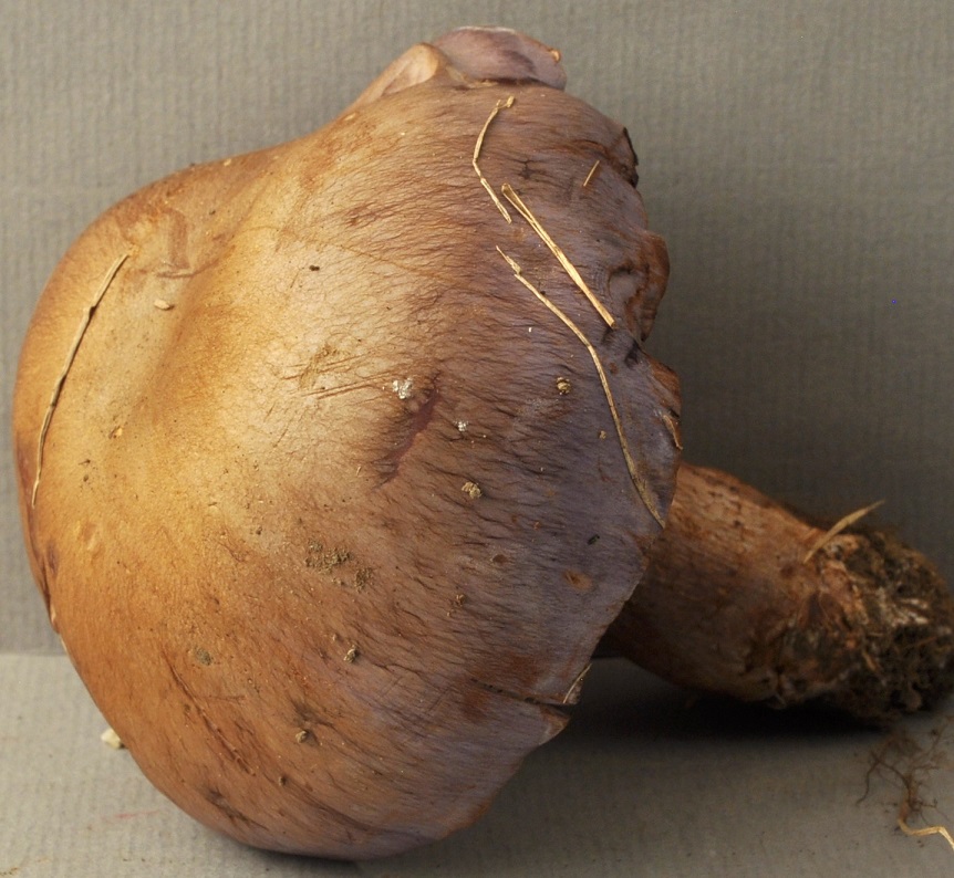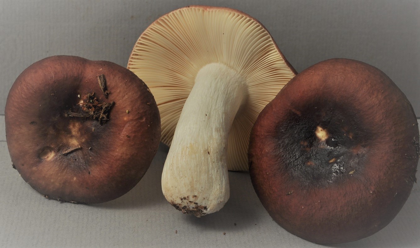 dessous, CD7-3 33/35. Chapeau pourpre brunâtre uniforme. Lames crèmes. Stipe fortement salissant dans le bas. KOH rouge bas du stipe. Ga S+++ L+++.