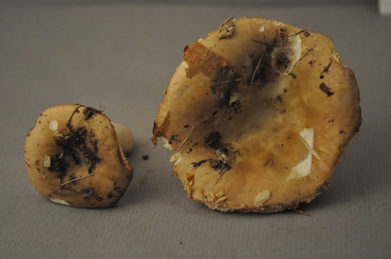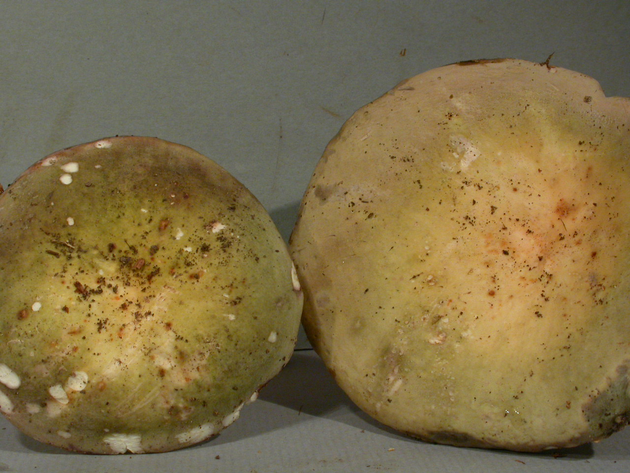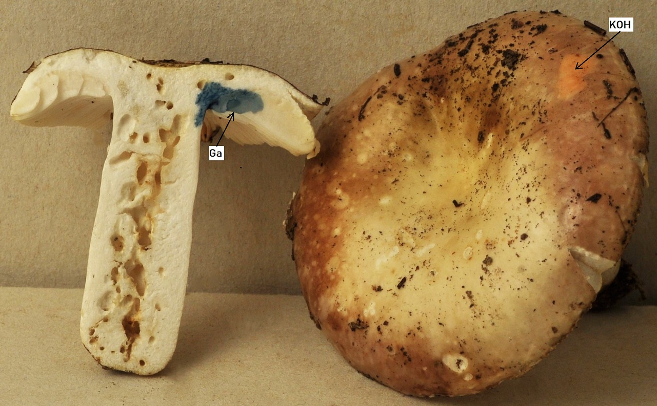 autre ex. Φ 100 mm: chapeau, CD8-F9 61/64. Ga S+++ C+++ . KOH rouge bas du stipe (lent). A noter que le deuxième ex. à coloration différente n'est pas sans rappeler le chapeau de R.romellii.