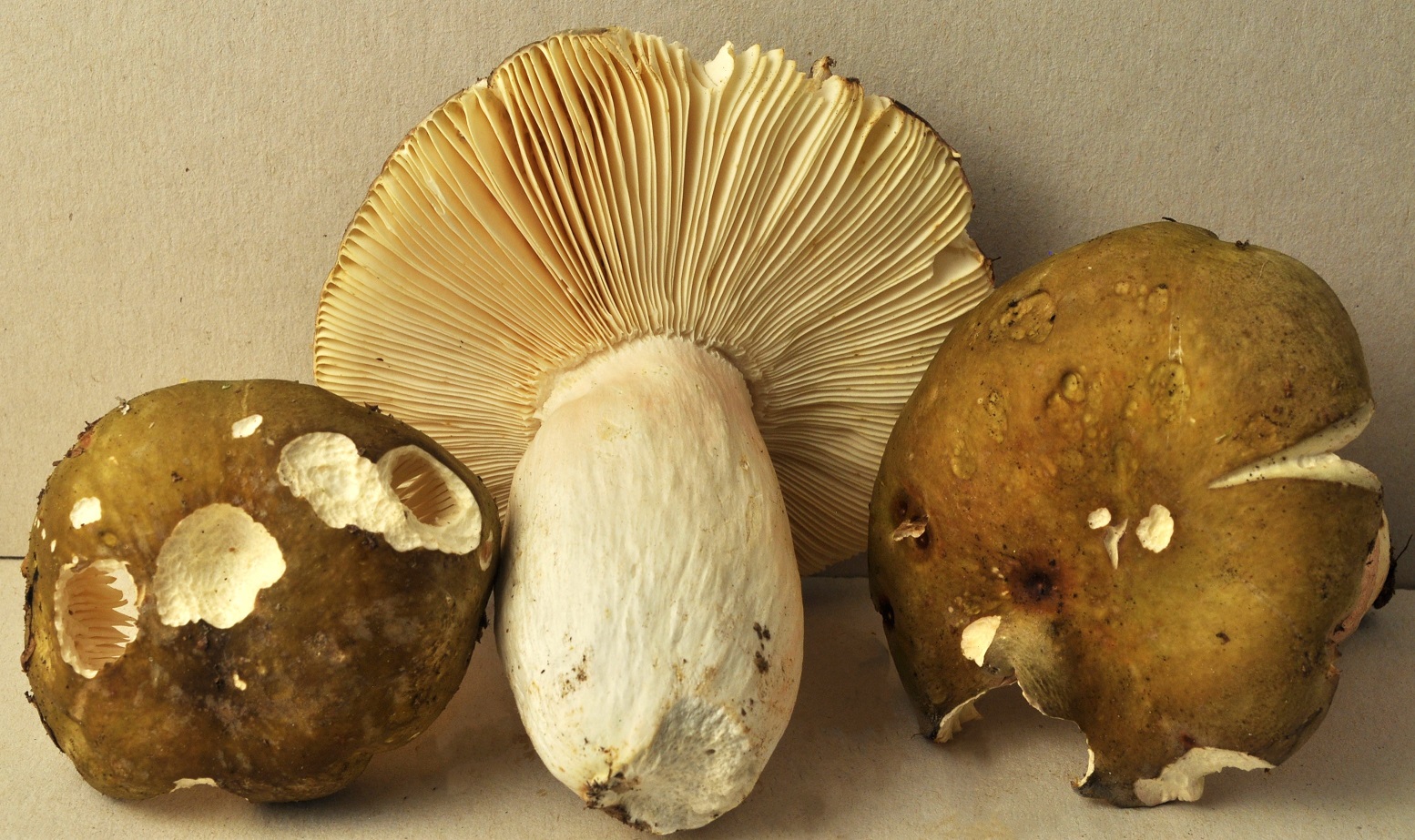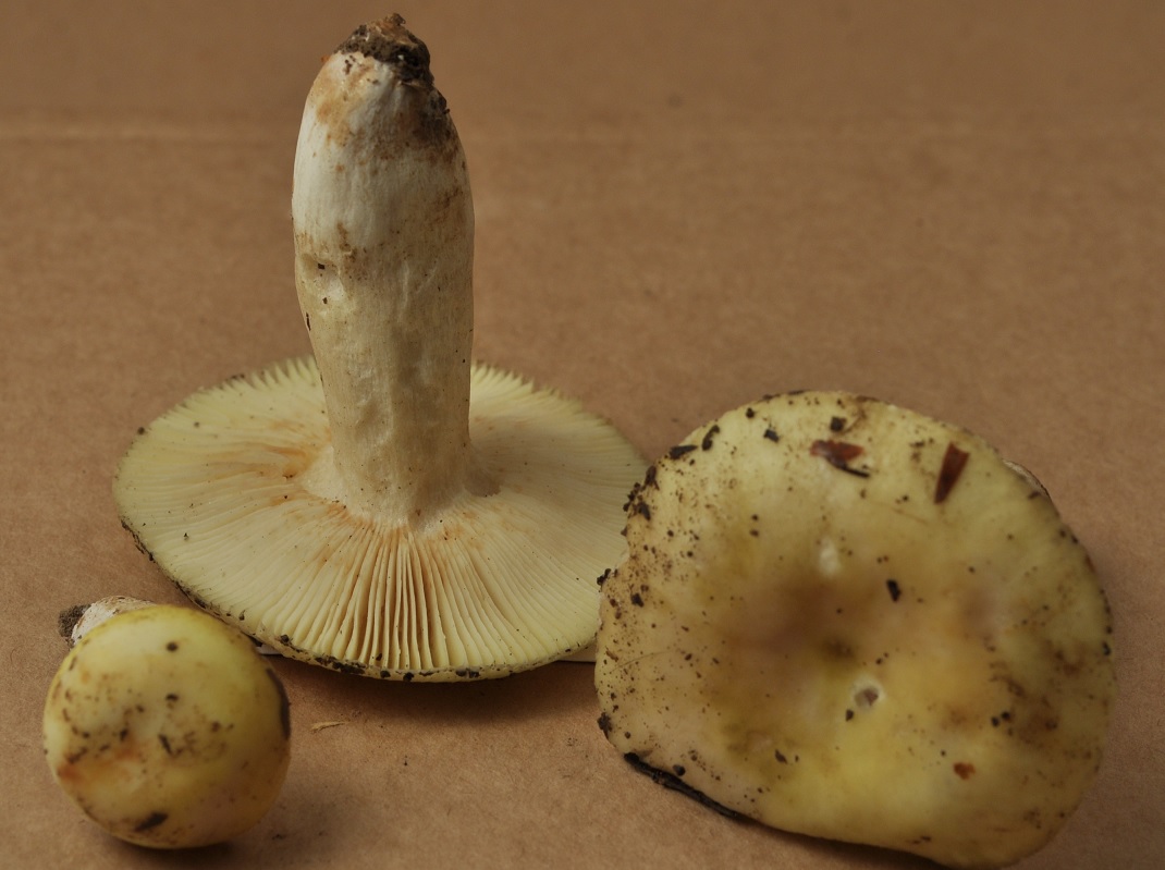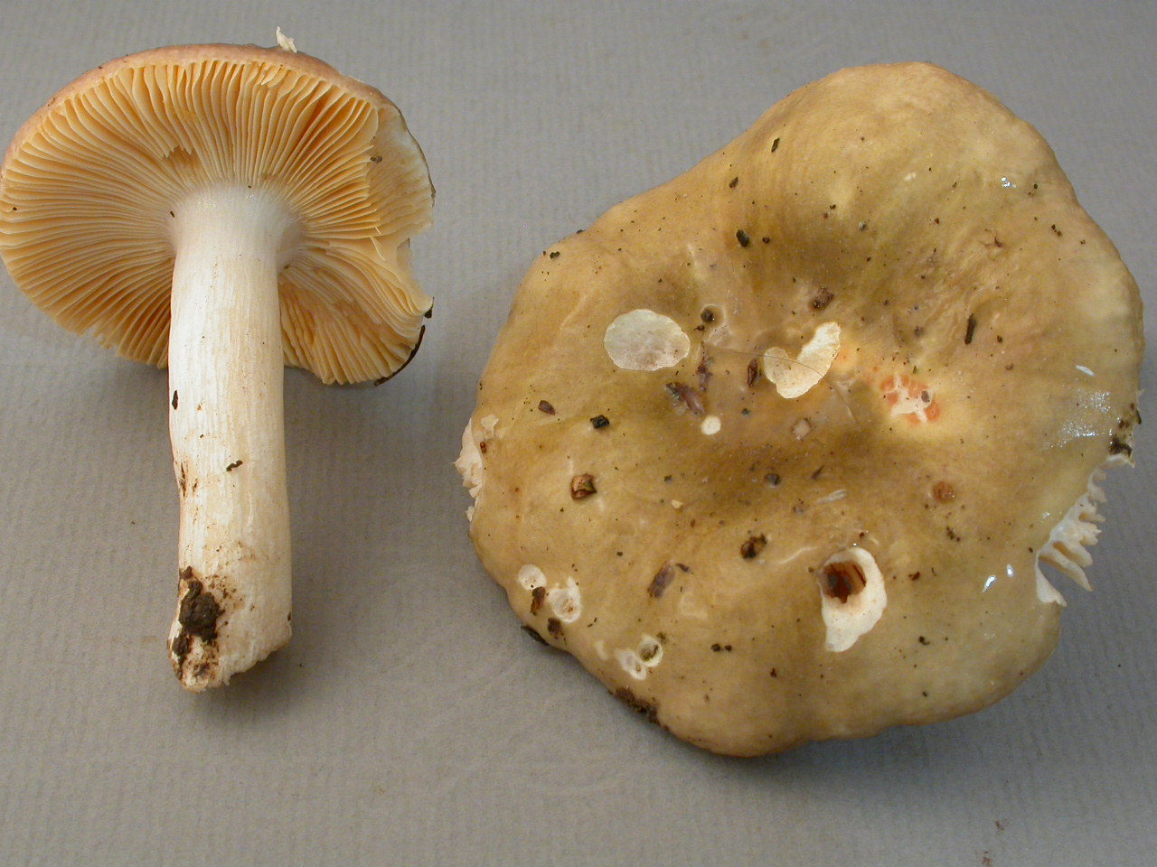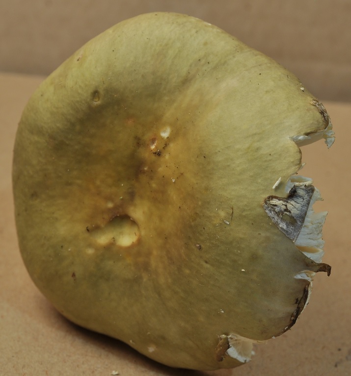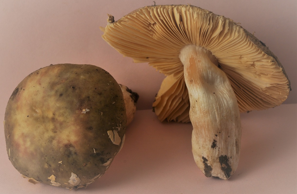 coupe, CD8-F3 78,81. Chapeau jaunâtre, verdâtre pâle, visqueux sur les 2 ex. adultes, marge striée (8 mm). Stipe blanchâtre, brunissant (pourissant ?) en bas. Lames crèmes, jaune verdâtre, puis une teinte citrine. Saveur douce. Odeur fétide (ex.pourissant). Ga S+ C+, Fe jaune puis orange. Phénol brun violacé (ambiguë, dépend de la lumière).